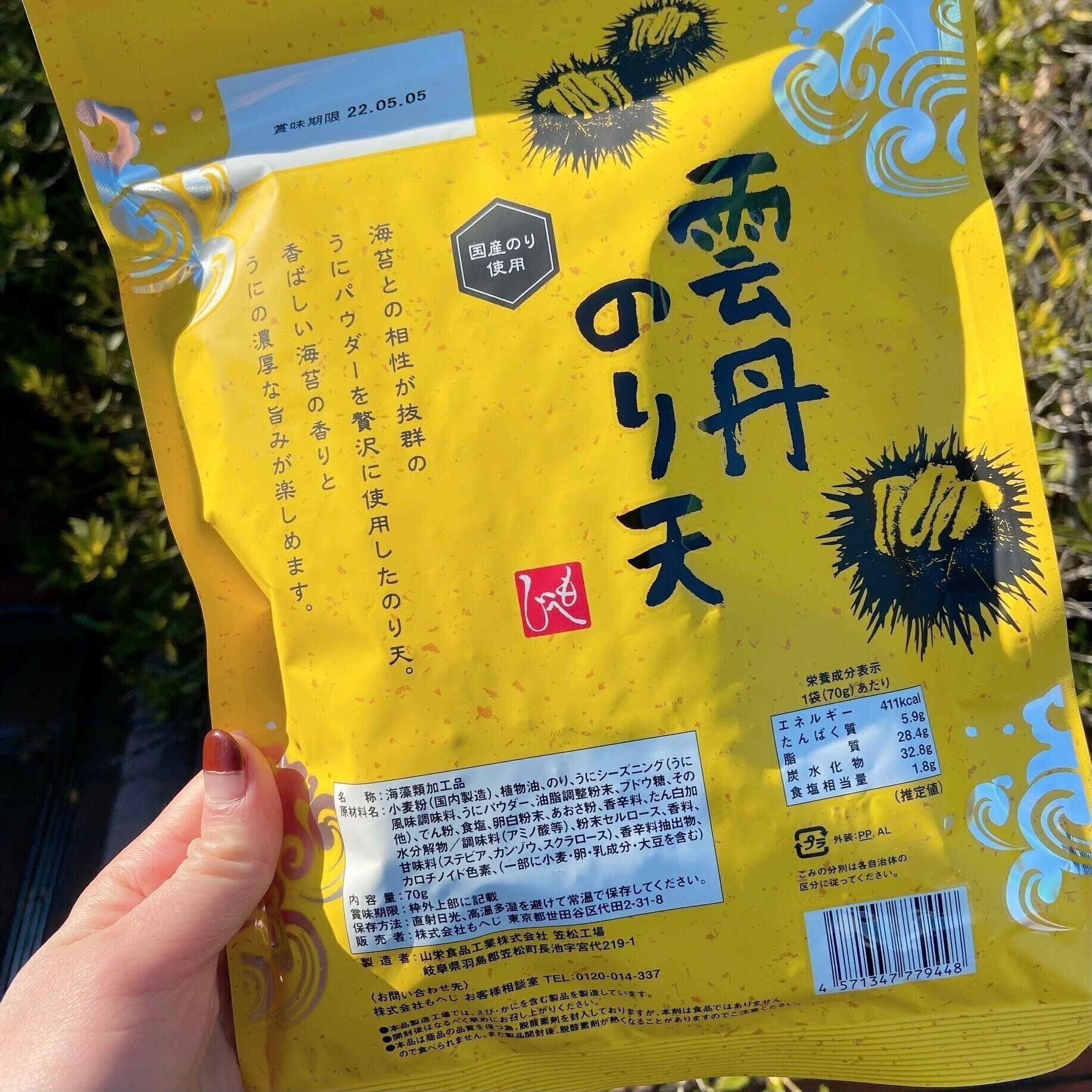 おいしいと話題になっている雲丹のり天は店頭でも大きなロゴと黄色のパッケージですぐに見つけられます。