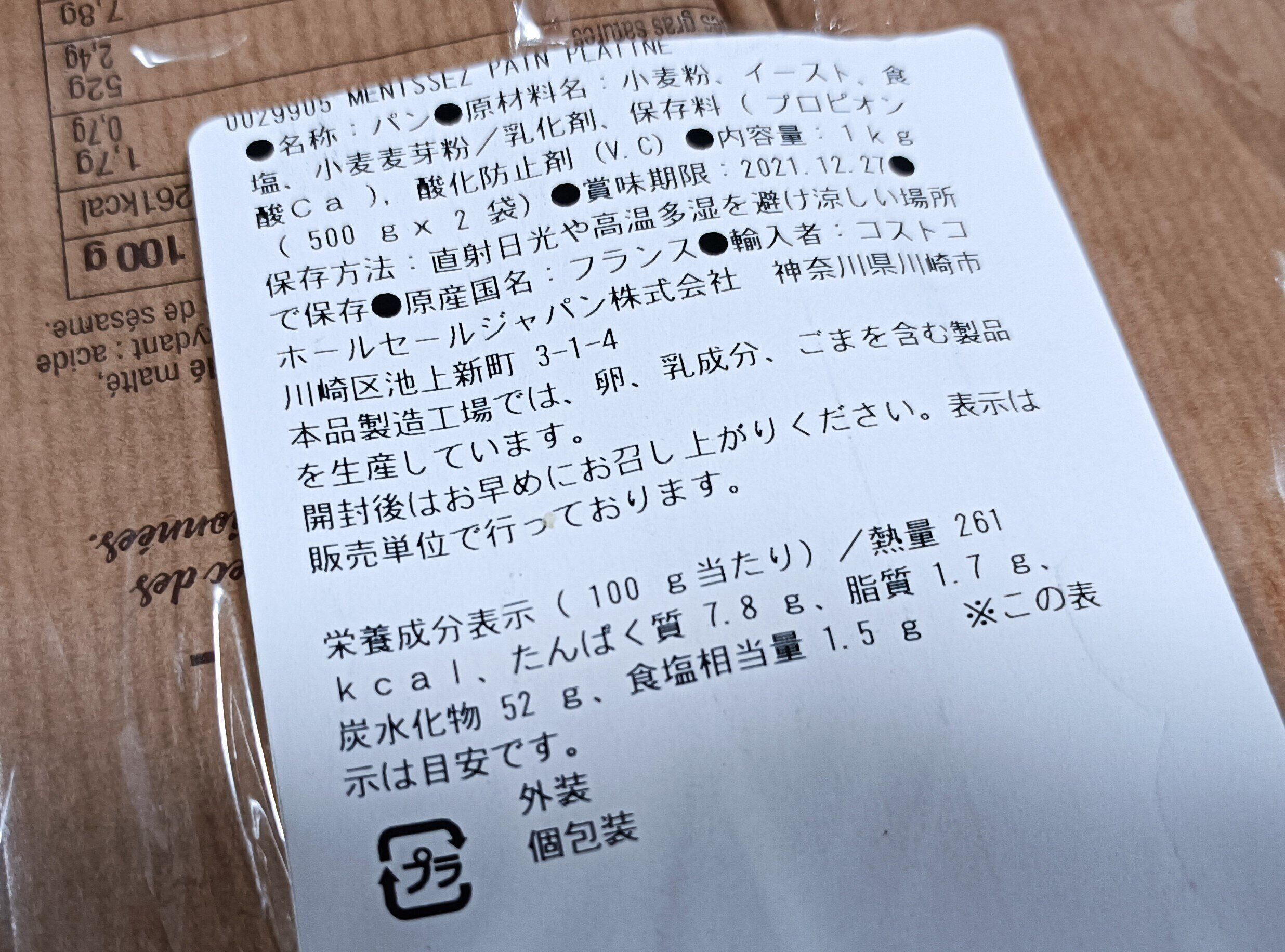 「メニセーズ パン プラチーヌ」は、1袋の500gのパンが2本入っています。