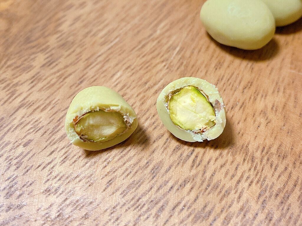 一粒一粒、ピスタチオを練り込んだホワイトチョコレートでコーティングしています。