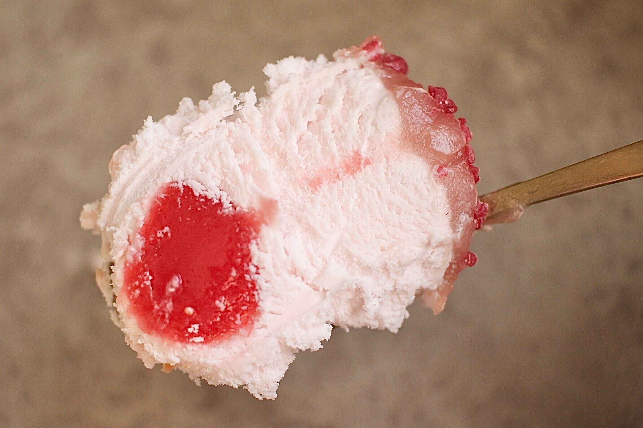 スプーンを入れると全体的に柔らかいテイスト。いちごあんが濃厚でねっとりと舌にまとわりつきます。いちごミルクアイスはさっぱりとした味わいで甘さがくどくなく食べやすいです。