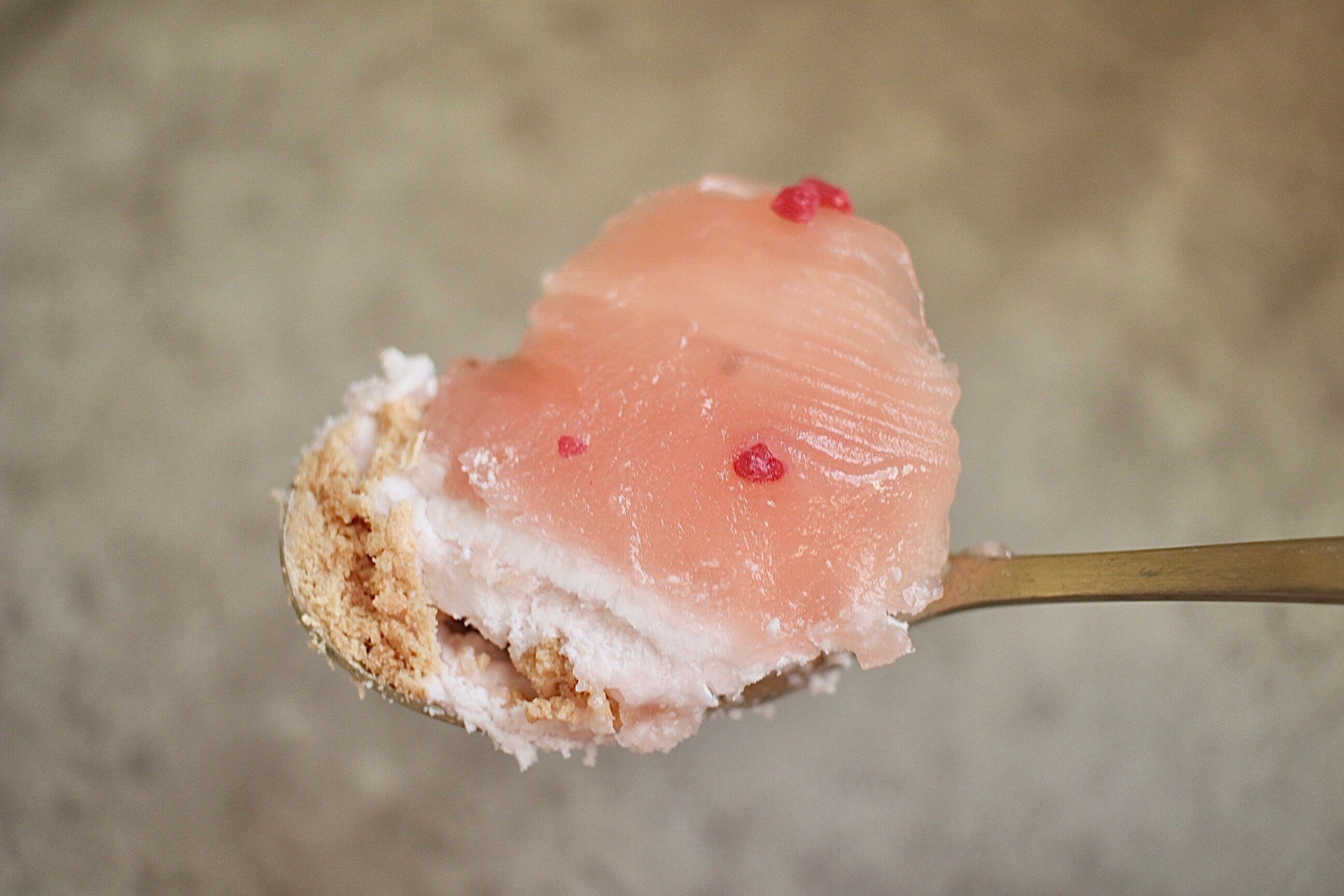 真ん中にたどりつくと、いちごソースが出てきました。想像以上に甘酸っぱくすっきりとしてアクセントになっています。
