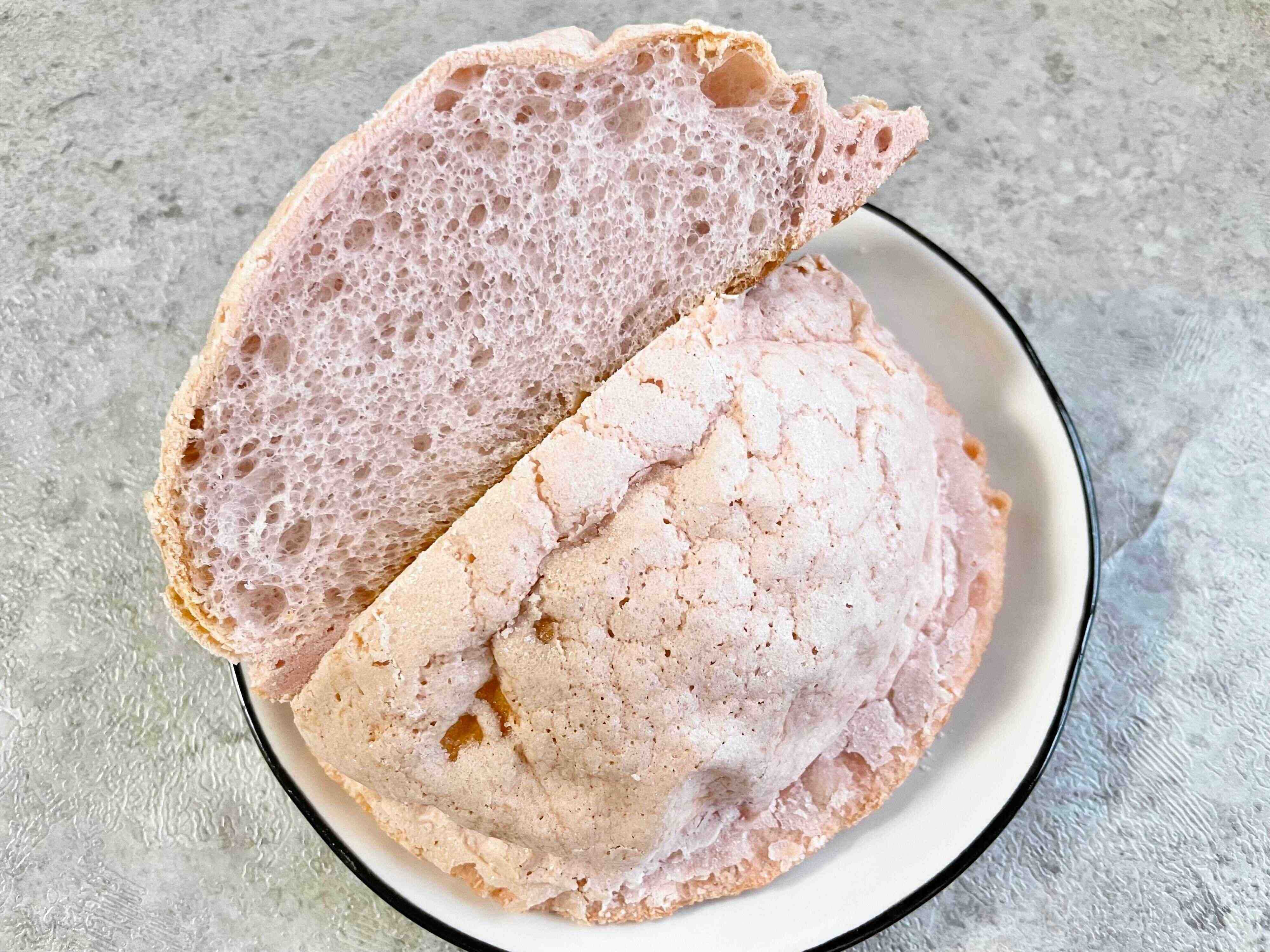 表面はビスケット生地をかけて焼きほんのり甘く、外はサクサク中はふんわりとしたパンです。