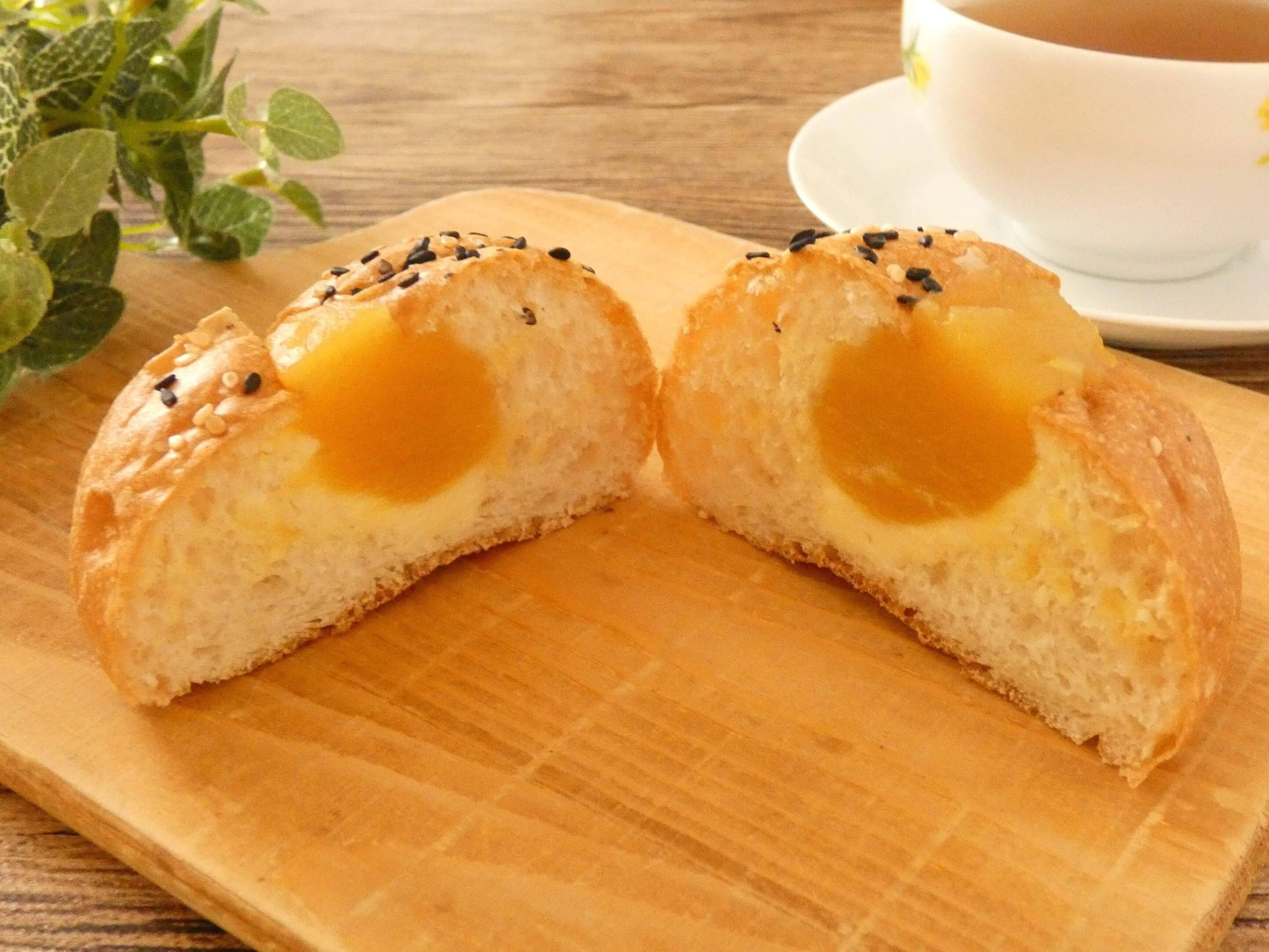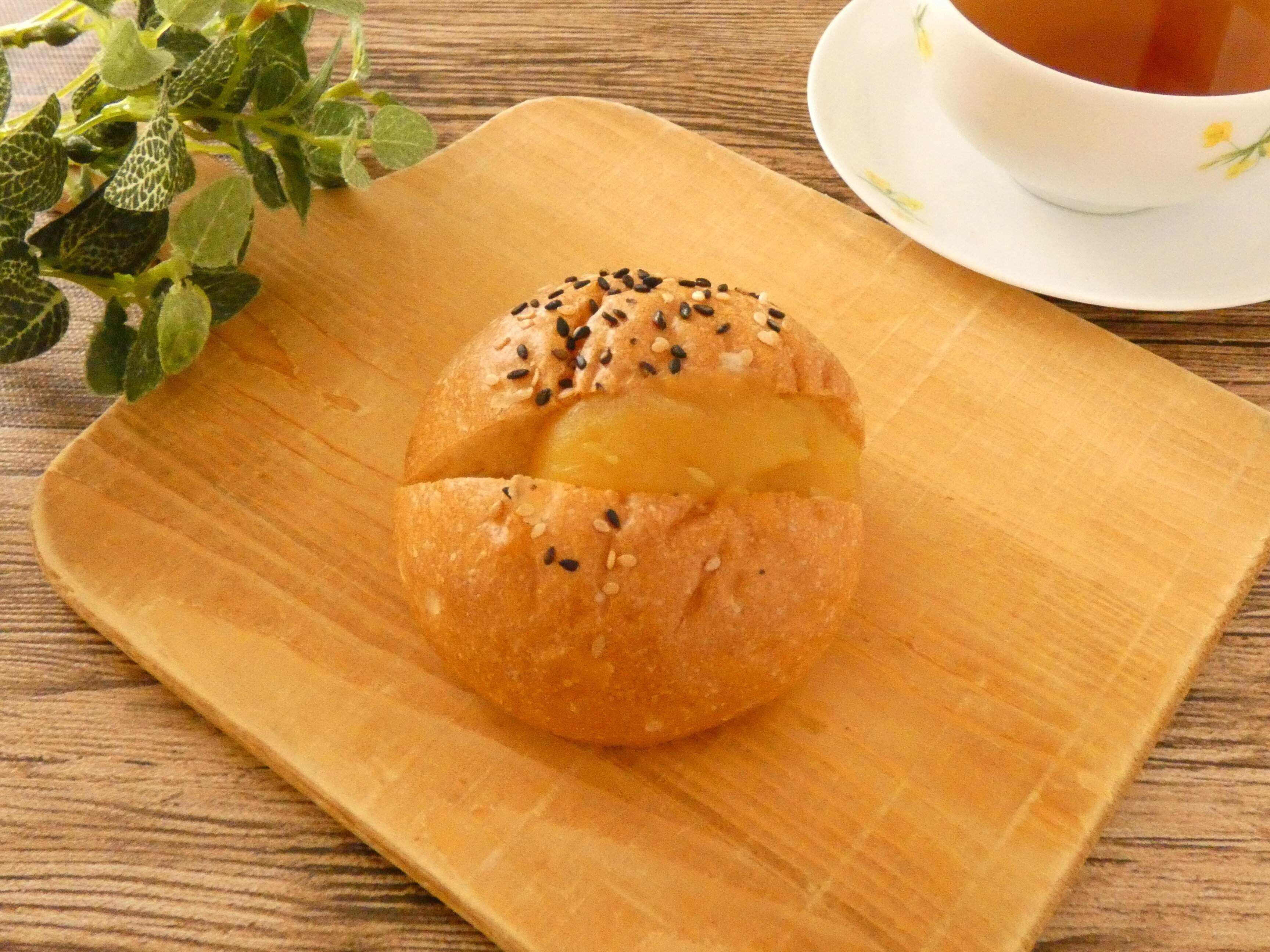 小ぶりでまん丸のフランスパンになめらかな焼きいもあんとバターが入っていて、上にはゴマがかかっています。