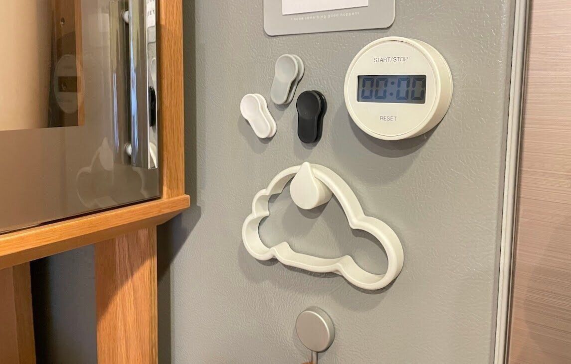 このスライダーはマグネット付きなので、使わない時は冷蔵庫にペタッとくっつけておくこともでき、モノトーンカラーなのでインテリアの邪魔にもならず、さりげなくくっつけておくことができますよ。