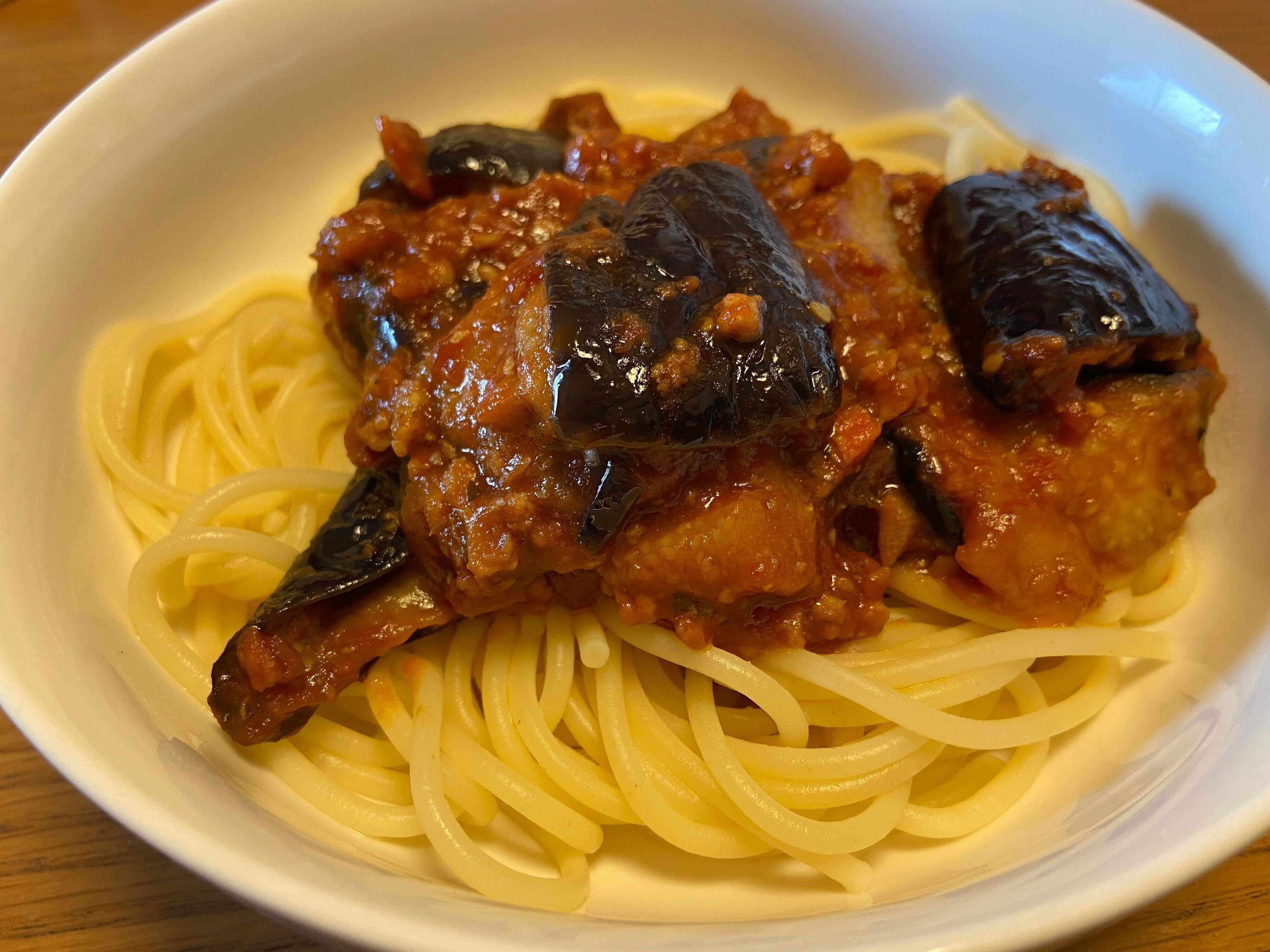 茄子のミートソーススパゲッティにしてみました。1.8mmと少し太めの麺はむっちりもちもちの弾力感がたまらないおいしさ。そしてソースがしっかり一本一本に絡んでいます!小麦の風味と食べ応えのある食感がやみつきになる味わいです。