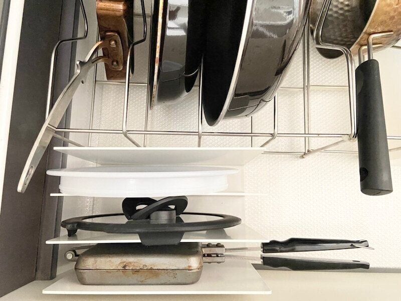 書類やタブレットなどを収納するのにも便利なスチロール仕切りですが、我が家はキッチン収納で活躍中。コンロ下の引き出しでは細くて高さのあるフタやホットサンドメーカーを、シンク下の引き出しでは配膳時のお盆をセルフで持ち出せるように立てて収納しています。