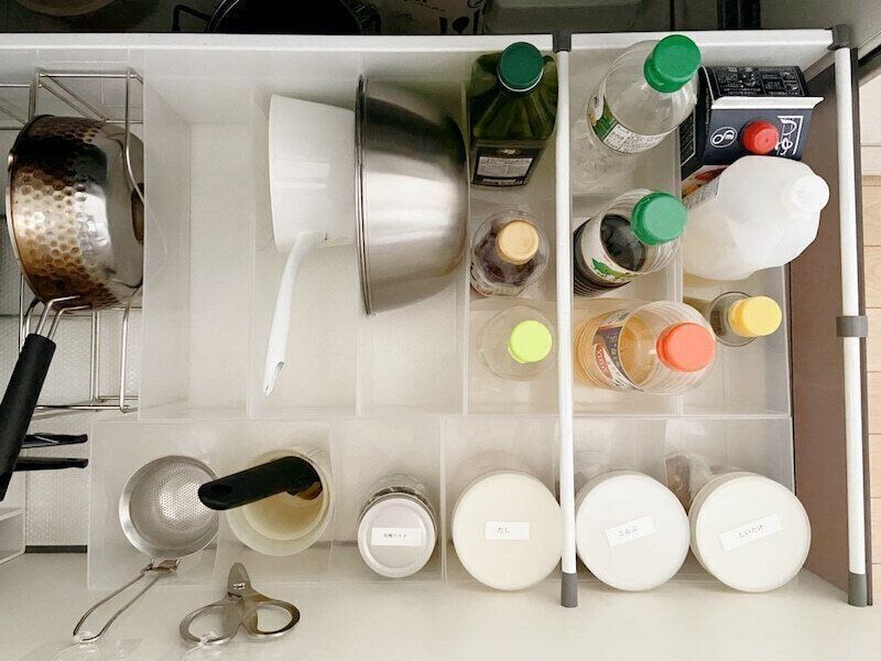 鍋やボウルなどの大きなものはそのまま収納で問題ないのですが、調味料やその他細々としたものを仕切りなしで収納していると、引き出しの開け閉めの振動や戻した時に置く位置が微妙にずれていくことで少しずつ収納が乱れていきます。