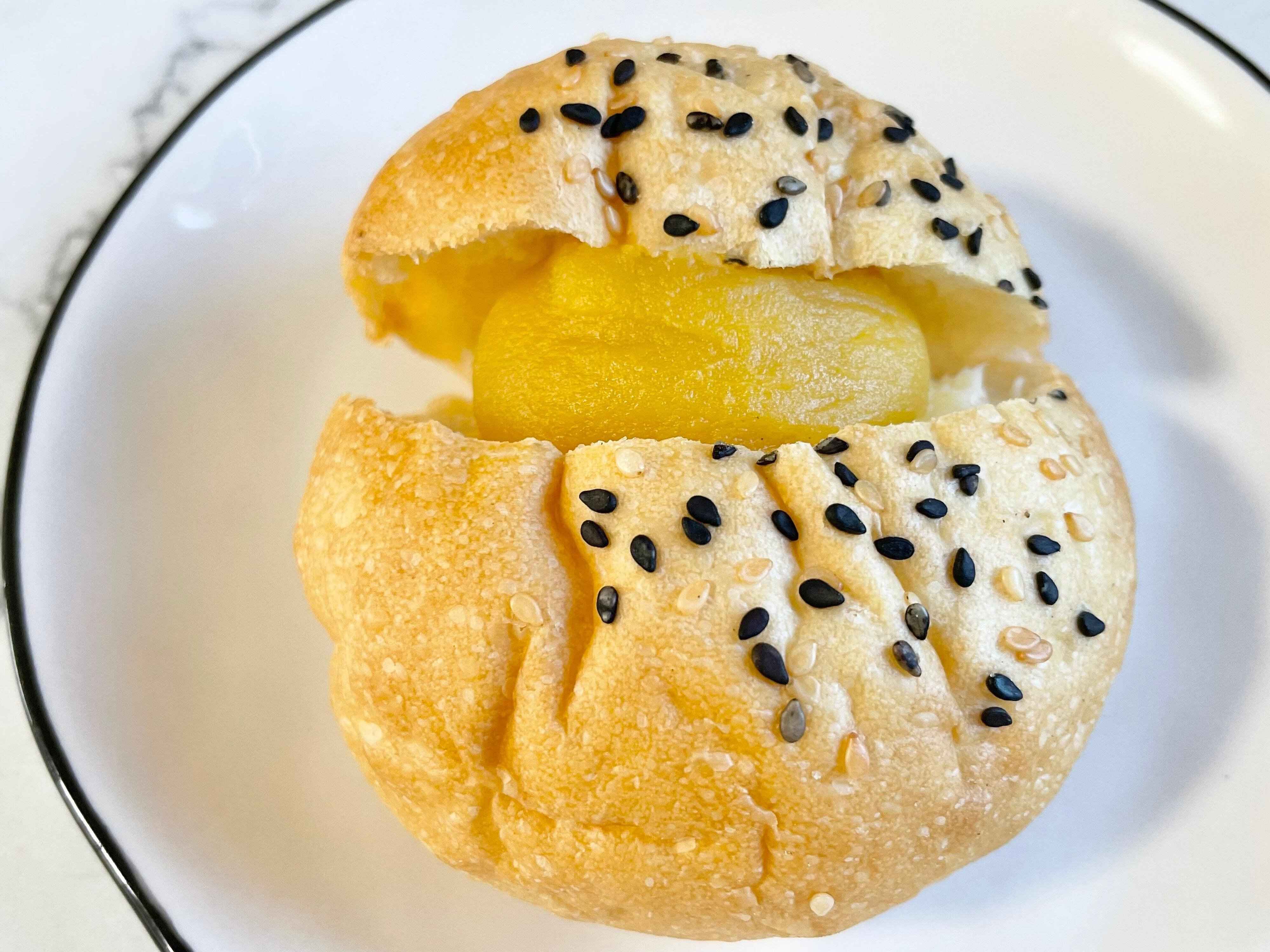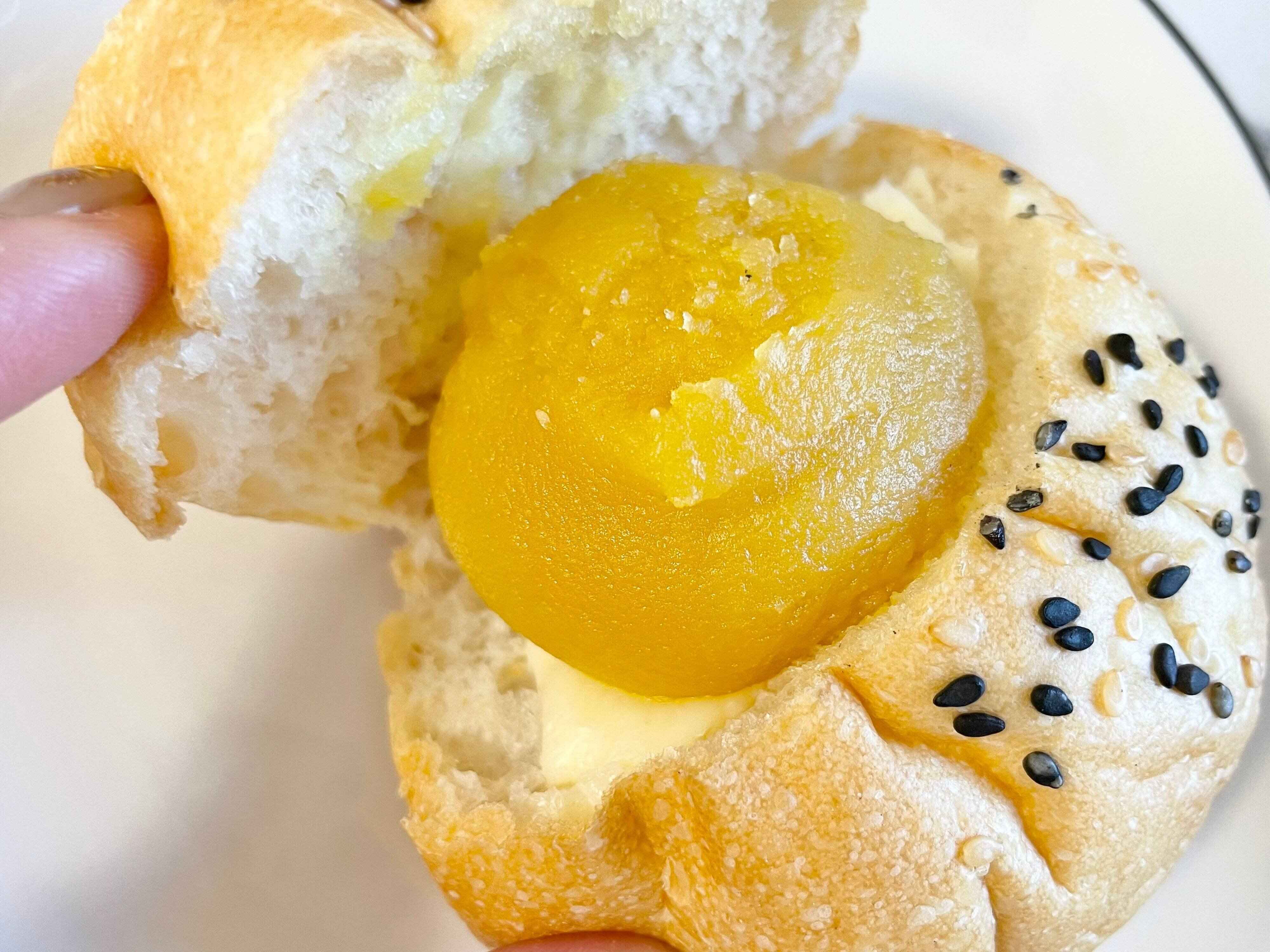 ごまをトッピングしたもっちりとした生地に、有塩バターと焼きいもあんが挟まれています。
