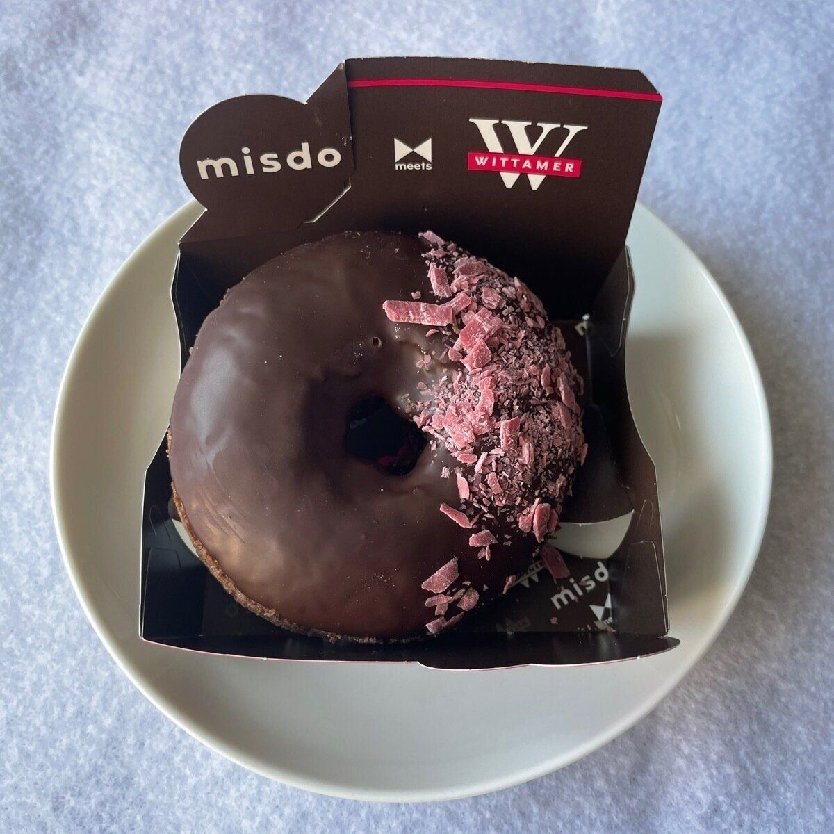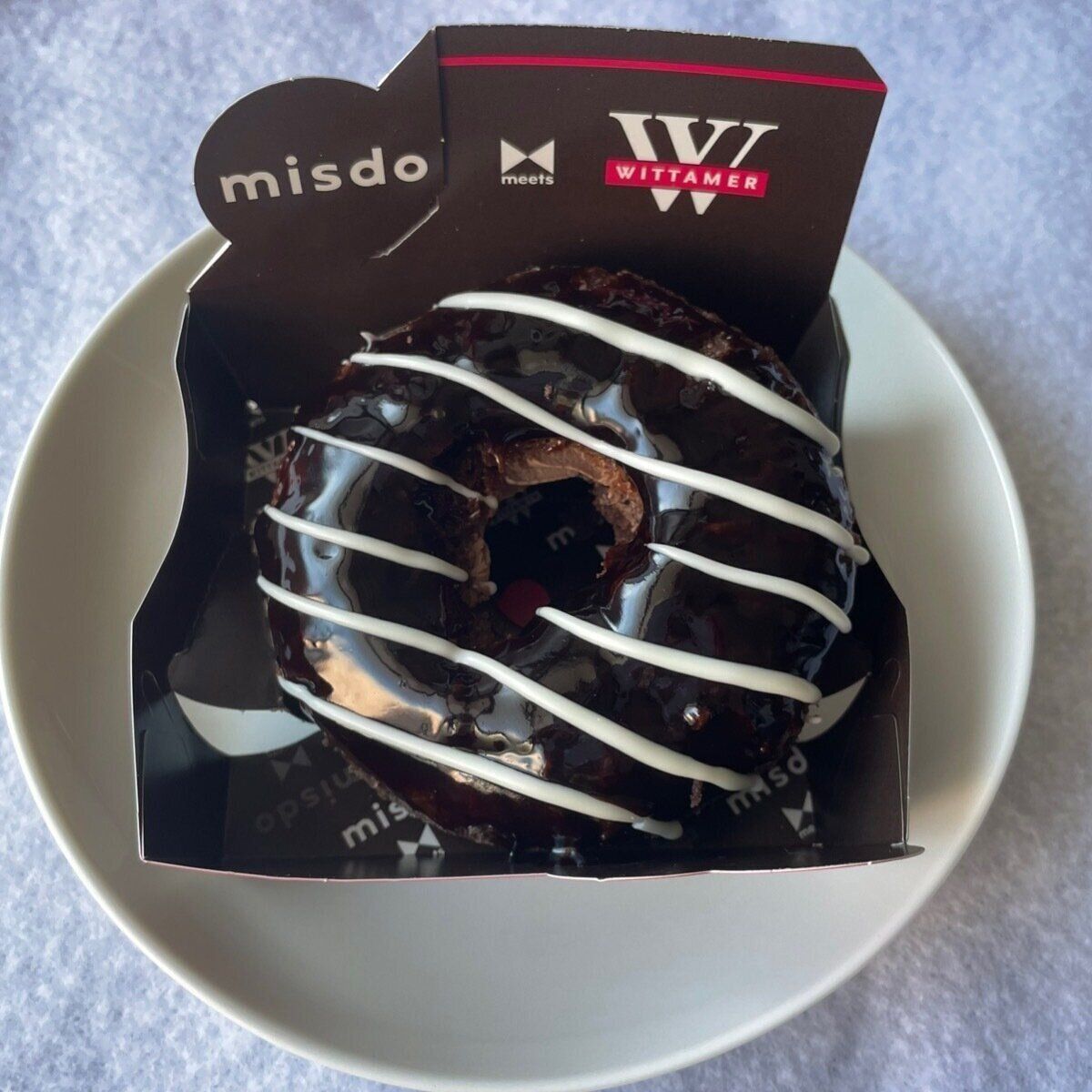 ヴィタメールの代表作「ショコラ サンバ」をドーナツで再現。艶やかなチョコレートにホワイトチョコの線がけはインパクト抜群です。