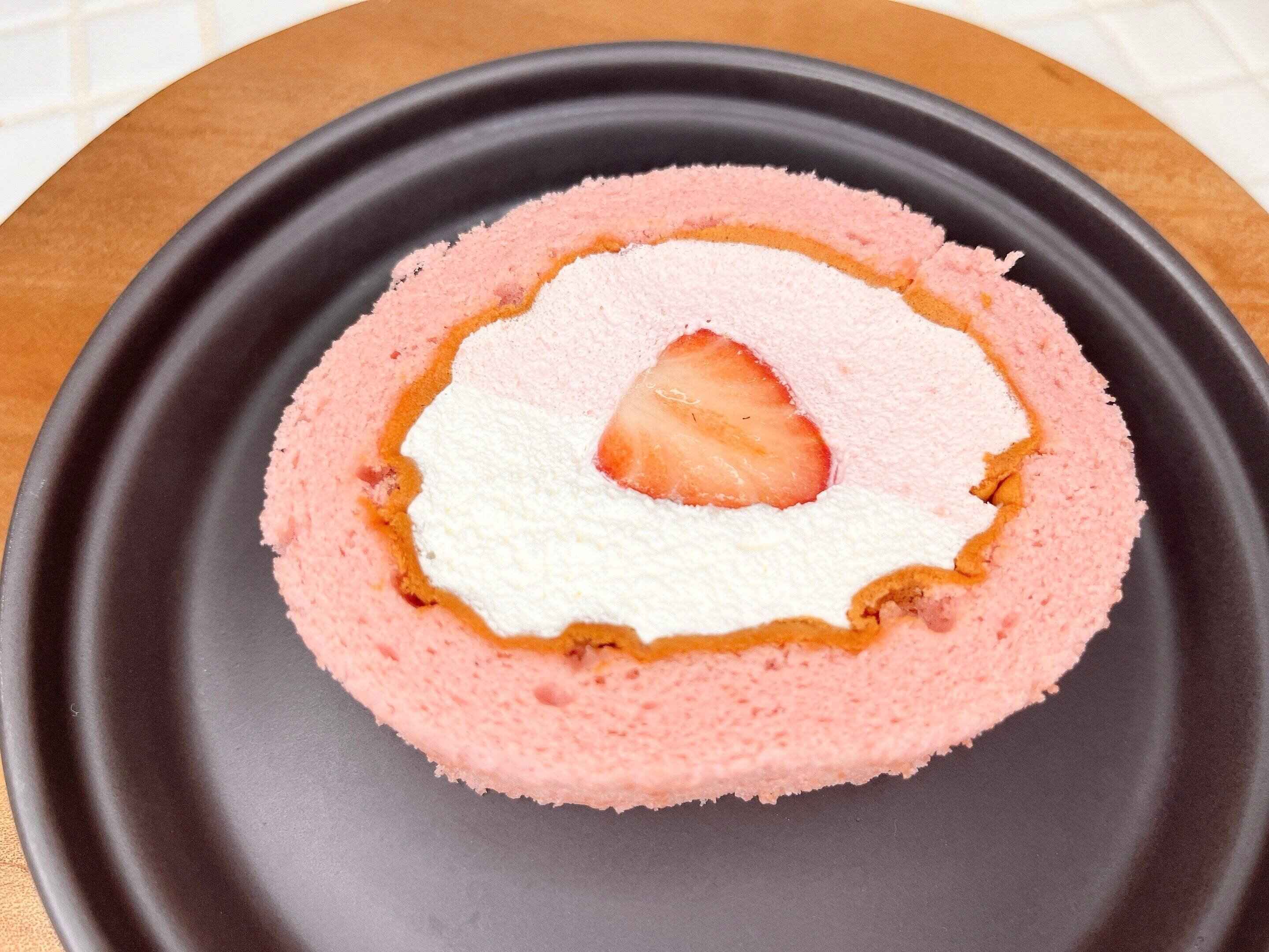 ロールケーキなのにモチっと食感は斬新です!いちご風味の求肥ともちもち食感の生地が、思ったよりもちもちしています。