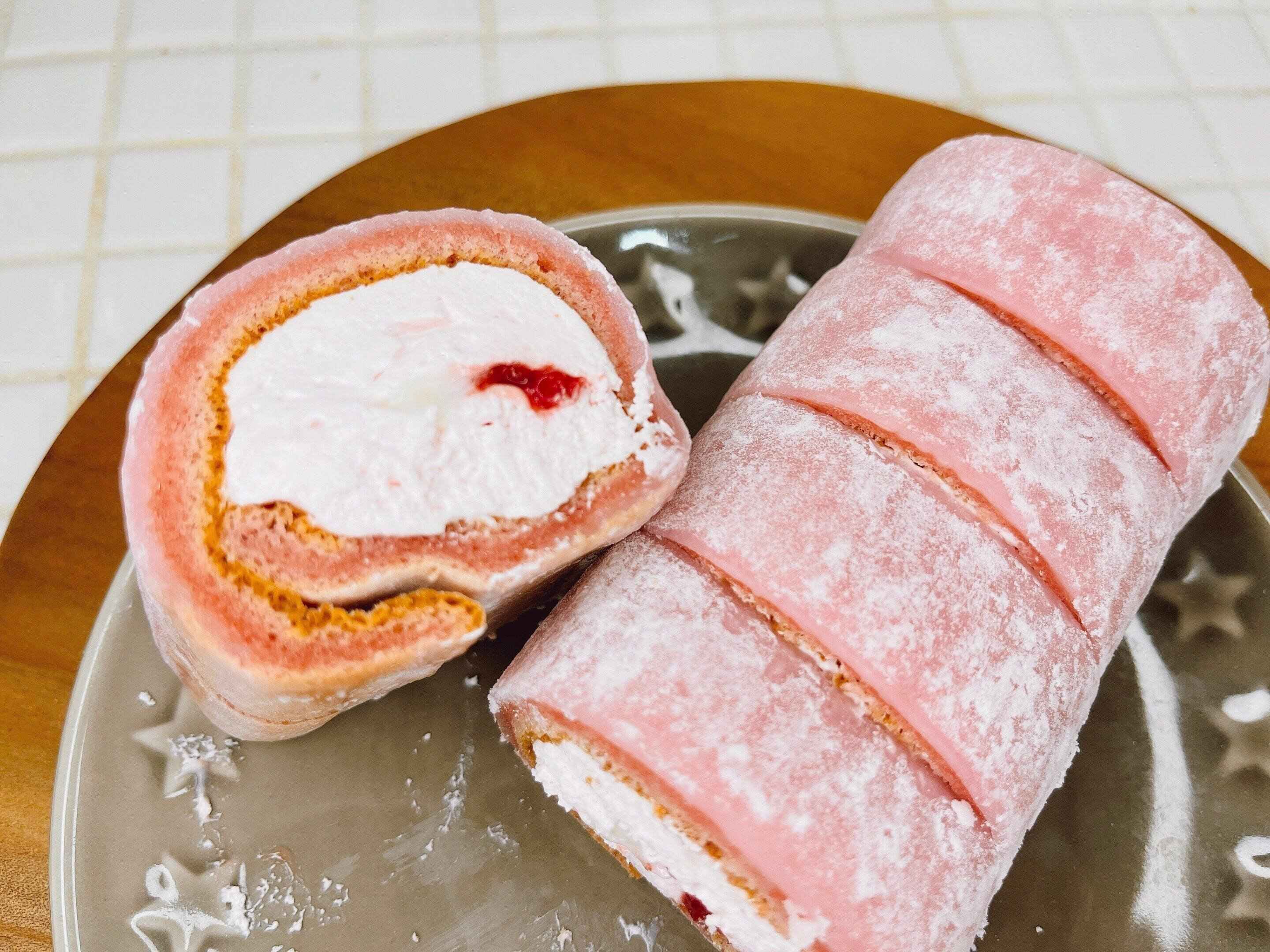 一見桜餅のような色合いのお餅に見えますがいちごみるく餅ロールです。もちもち食感の生地といちご風味の求肥生地を重ねて、いちごみるくクリームといちごソース、ミルクソースが巻かれた商品です。春らしく可愛い色合いですよね!