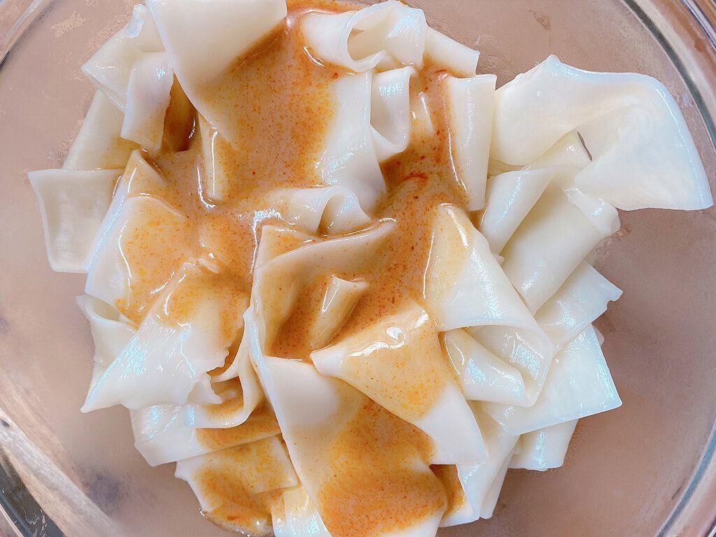 10分茹でてお湯を切ったら、たれを和えます。