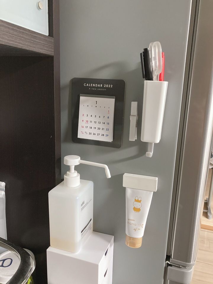 簡単に取り付けられるのに外れる心配もありません。冷蔵庫にピタッとくっつけておくと、使いたいときにサッと使えるのはすごく便利。チューブホルダーを付けたまま使えるのもいいですね。