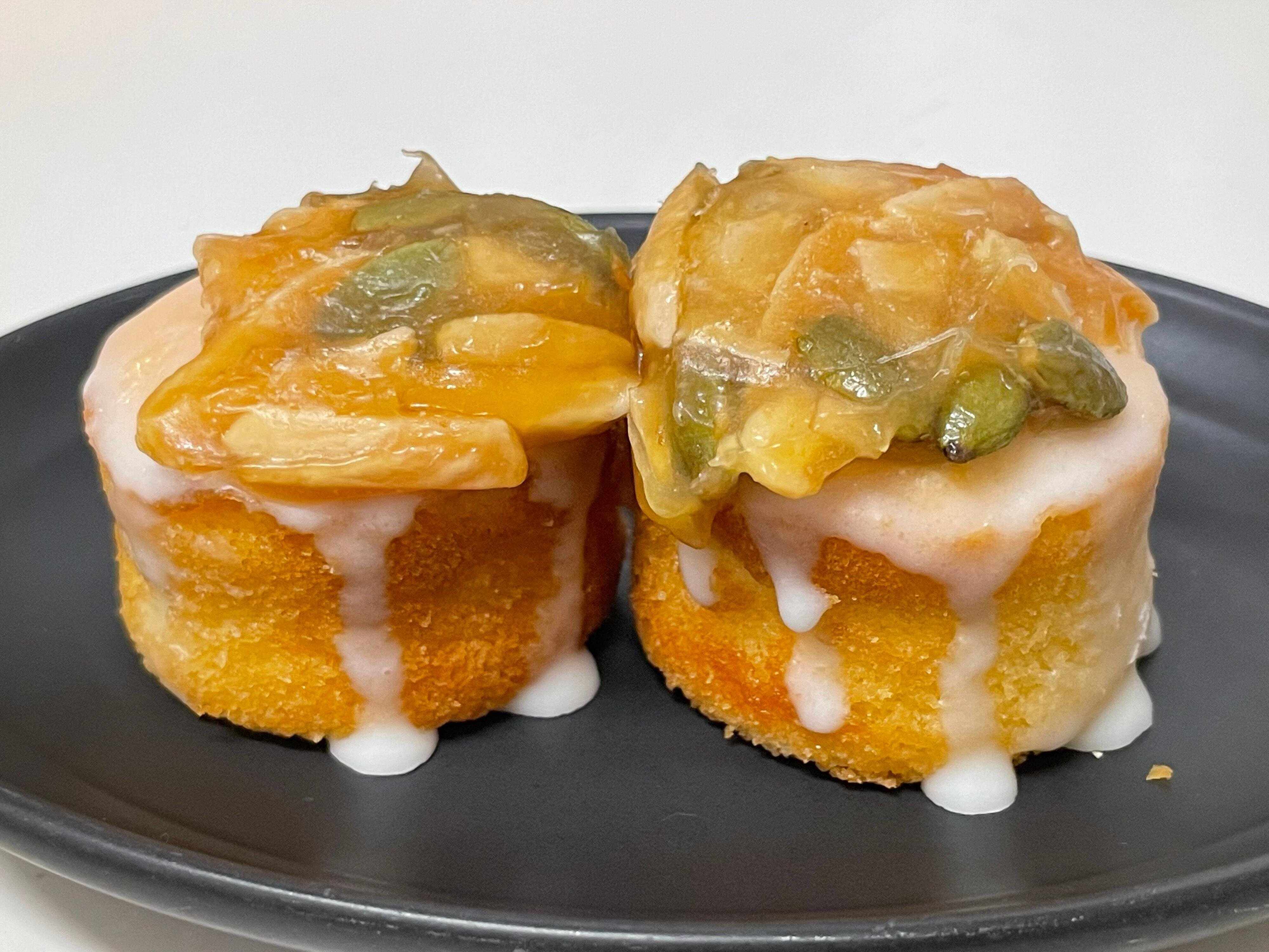 しっとりバターケーキにグレーズコーティングし、カリカリ香ばしいミックスナッツのキャラメルがけがのっています。