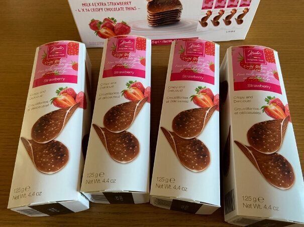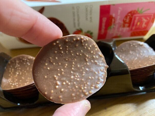 冷凍庫でしっかり冷やしてパリッパリにして食べるのがお気に入り。パフのサクサク感と苺パウダーの甘酸っぱさがアクセントになって、ついつい手が止まらなくなるおいしいチョコレートです。