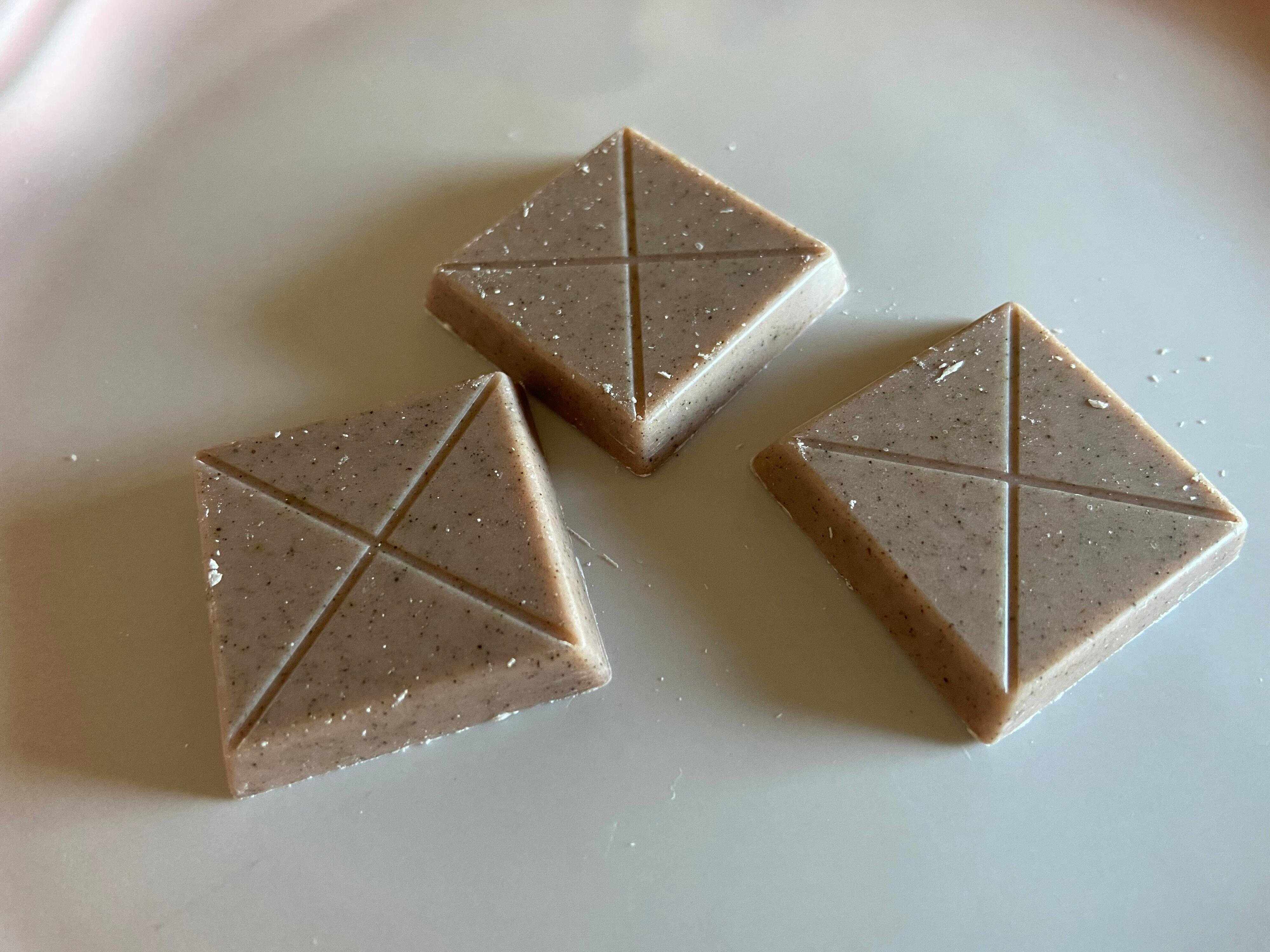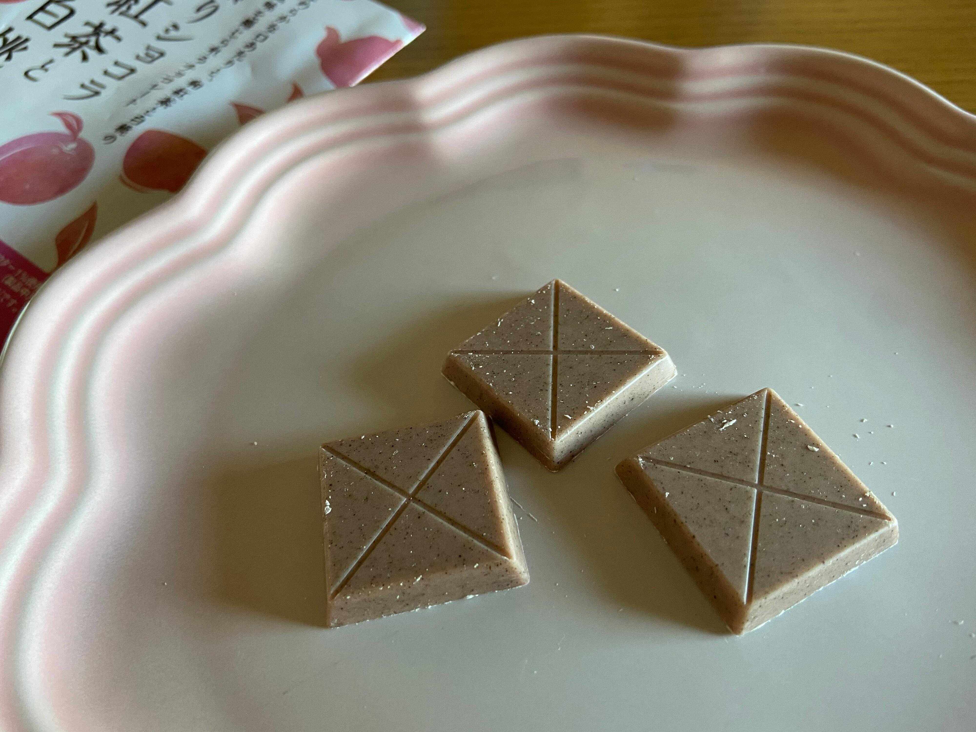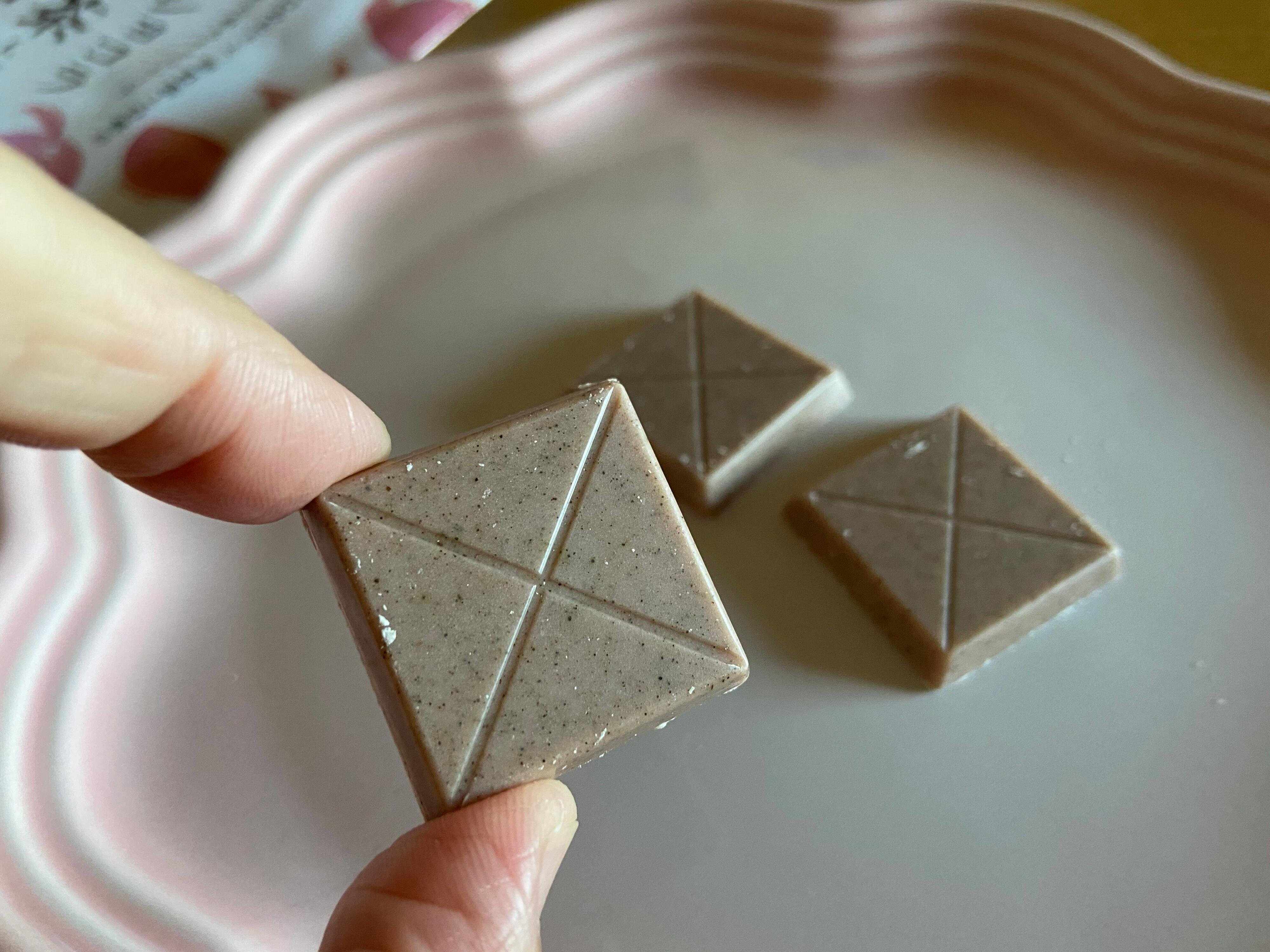 茶色い粒つぶは和紅茶パウダーとのこと。鼻に抜ける紅茶の香りがとっても心地よいです。後味にはすっきりとした桃の甘みも。桃と紅茶の組み合わせのチョコレートは初めて食べましたが、新感覚でとってもおいしいです!