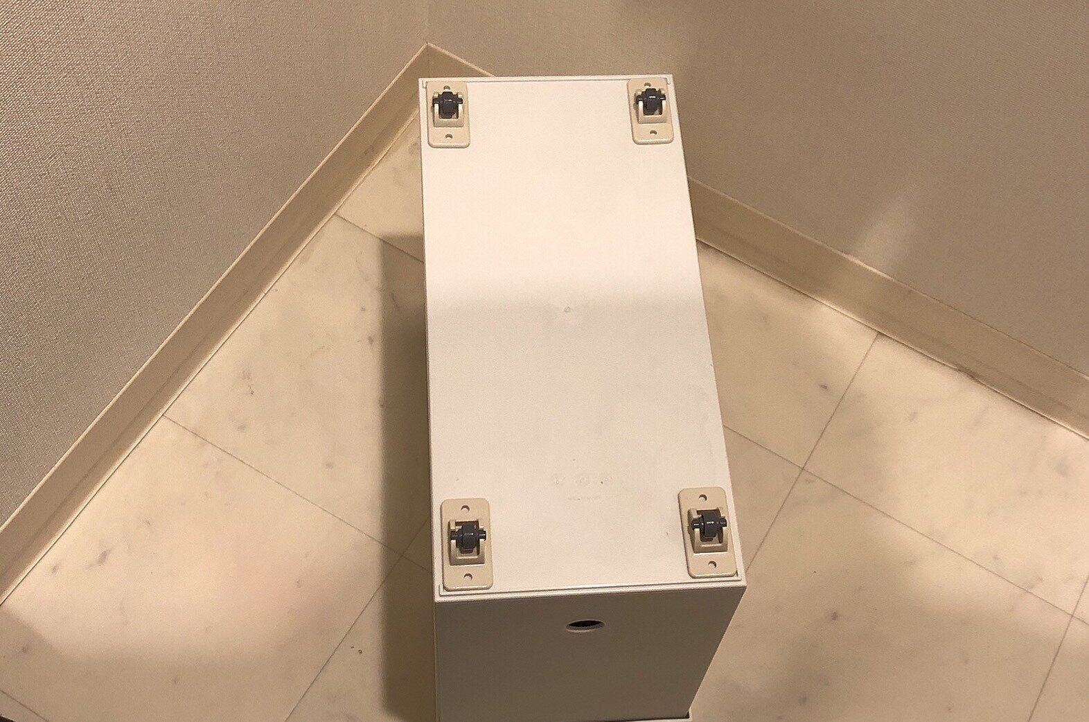 ファイルボックスの裏に4個所、キャスターを貼りました。粘着テープ式なので貼り付けるだけです。このキャスターは360℃方向転換しないので好きな方向に動かすことはできません。キャスターをつける位置に注意してくださいね。