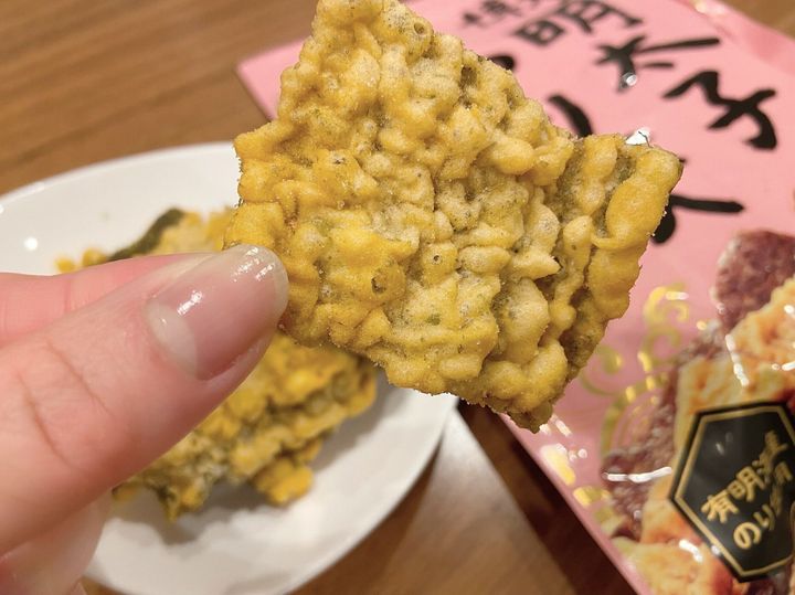 結構しょっぱめの味付けです。ビールやハイボールによく合うんだとか。歯ごたえも固めで歯応え十分、あっという間に食べてしまうお菓子。