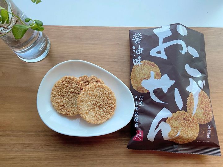 国産のうるち米を使用し、お米のつぶつぶ感をいかしたまま揚げた香ばしい醤油せんべいです。今までにありそうでないタイプのお煎餅で、けっこう厚みがあり、サクサクと軽い食感。
