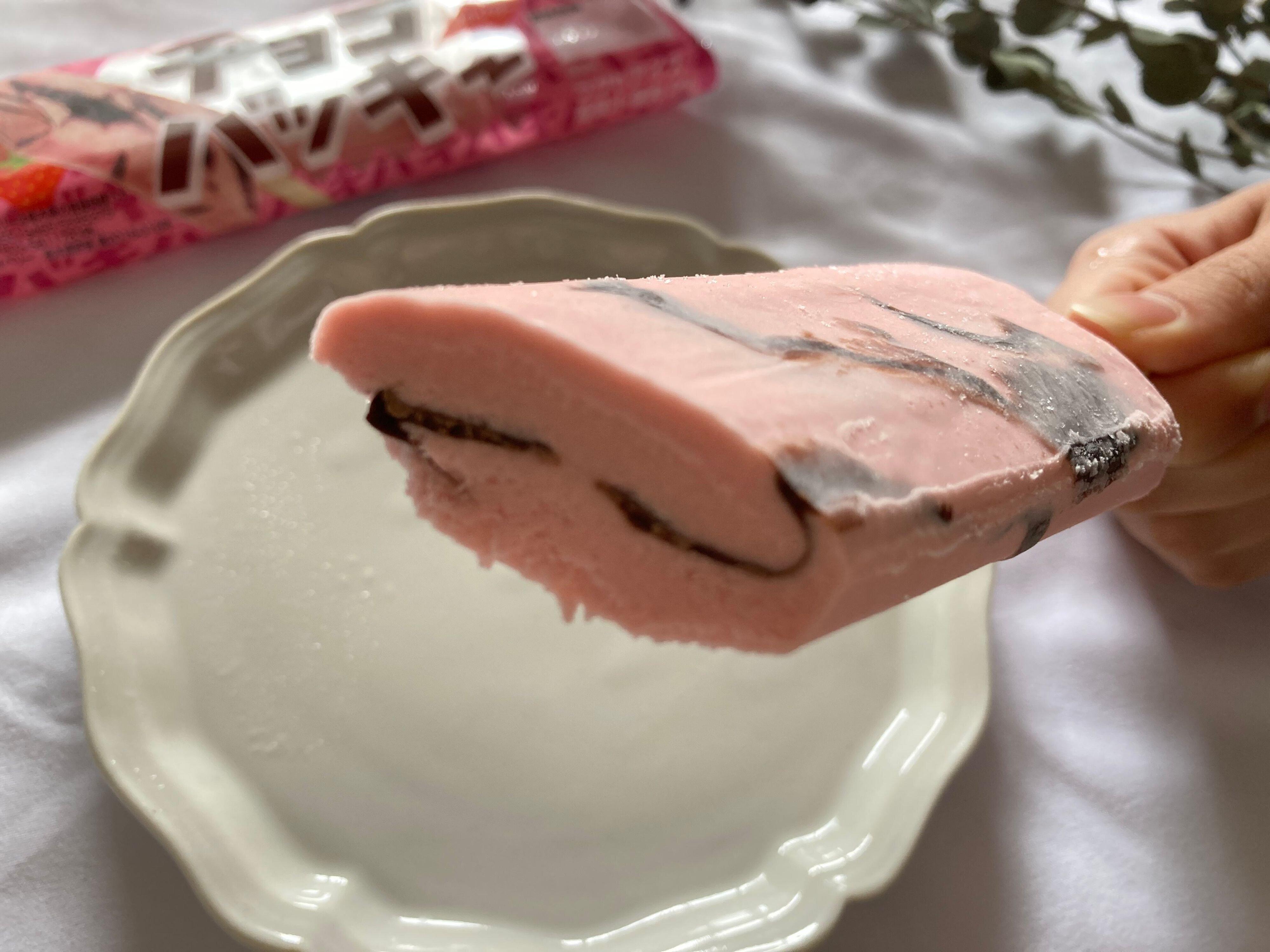袋から取り出すと可愛いピンク色のアイスにチョコが混ざったアイスが出てきます。