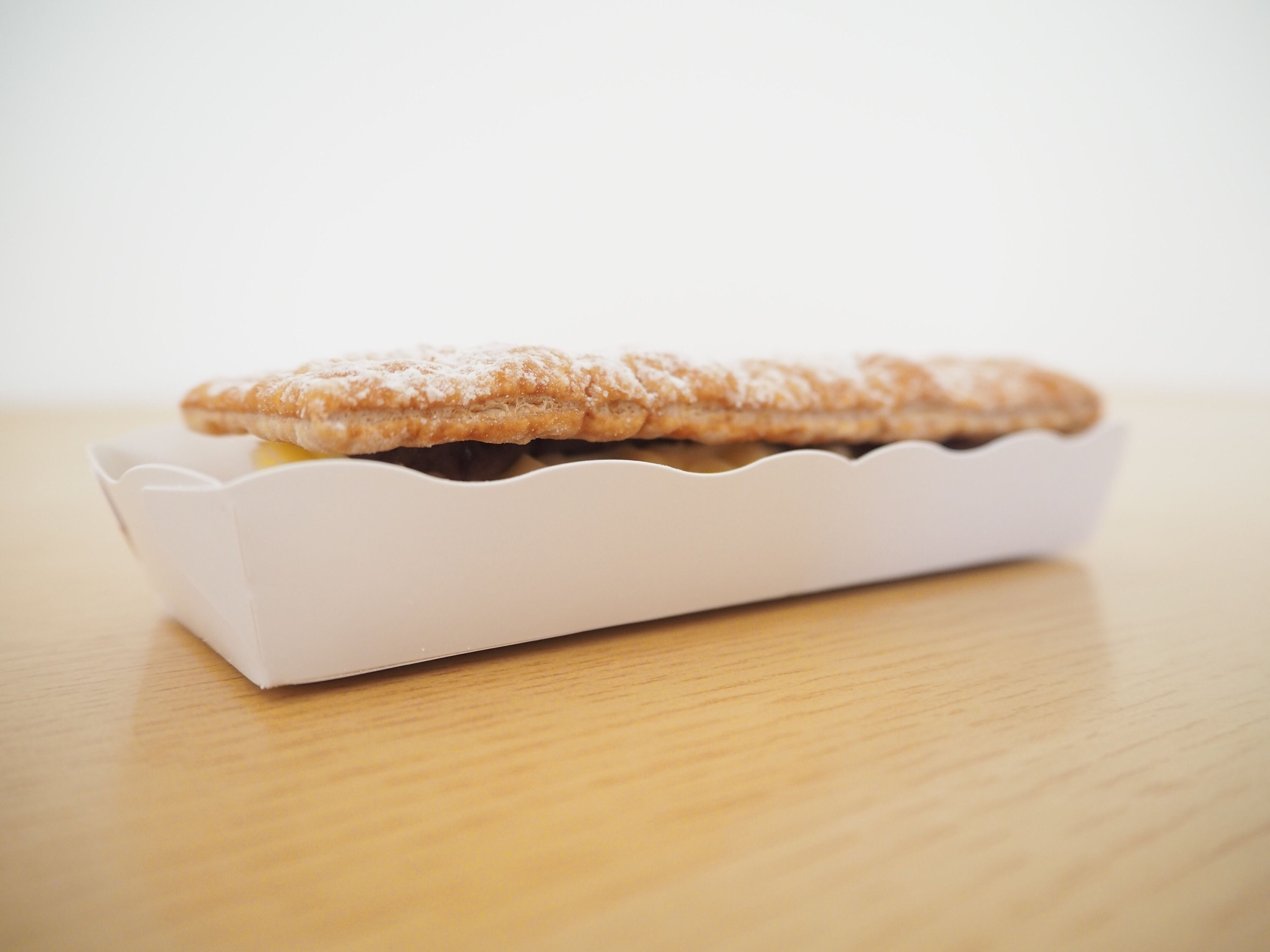 では、実食です!パイ生地には粉砂糖が振りかけられていて、上品な見た目に。