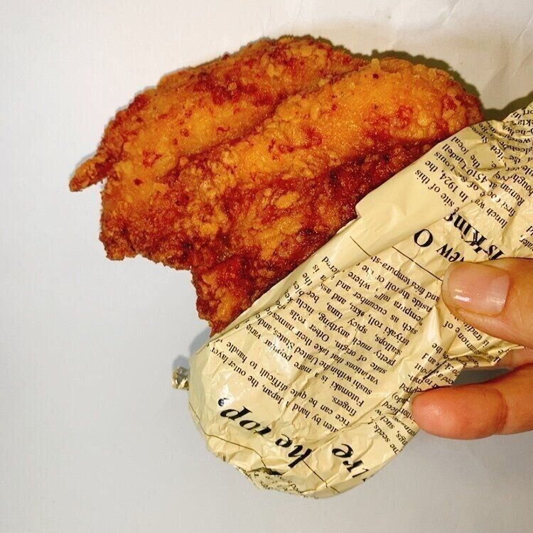 かぶりつくために、揚げた唐揚げにはアルミホイルなど巻くと手が汚れず食べやすいです。