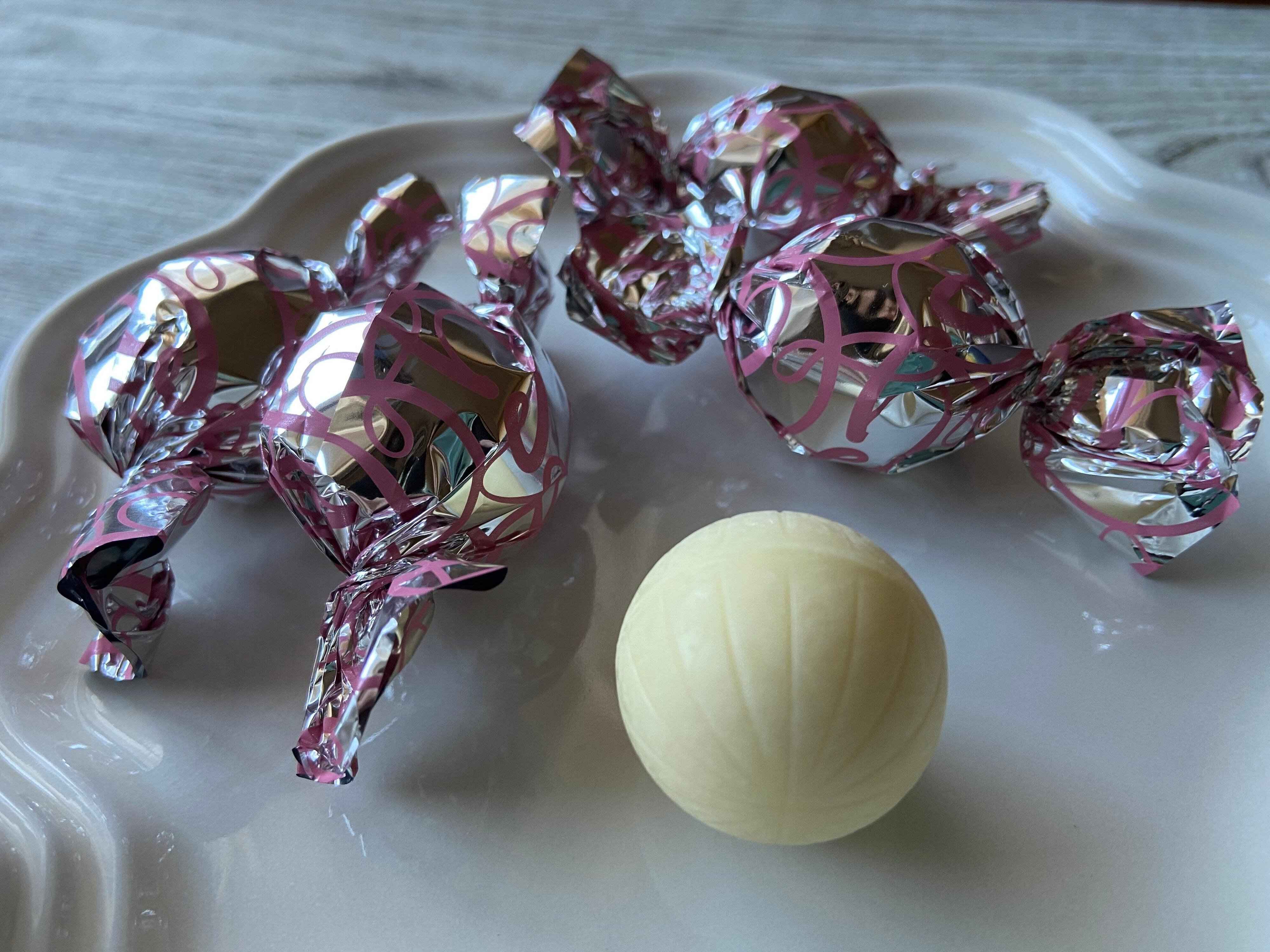 かわいいピンクとシルバーのキャンディのような包みを開けると、真っ白くて丸いチョコレートが!