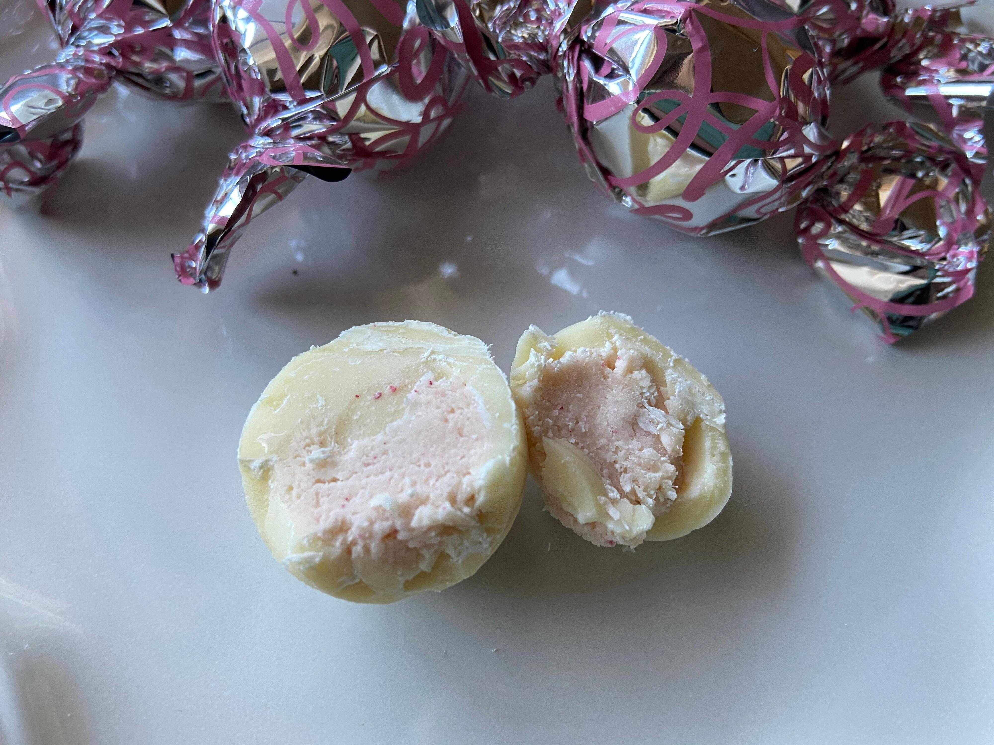 ラズベリーフィリングがホワイトチョコレートでコーティングされています。コクのあるミルキーなチョコレートにラズベリーの酸味が効いて、とってもおいしい!