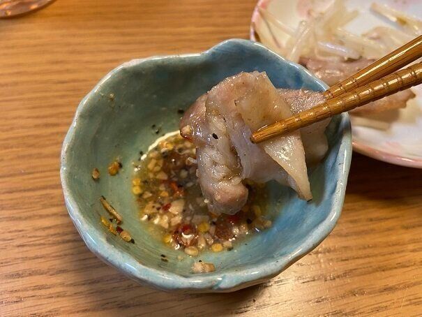 にんにく・塩コショウ・唐辛子が入ったシンプルな調味料、柑橘の果汁と合わせて少し塩の粒が溶けたころにお肉をつけて食べると絶品!