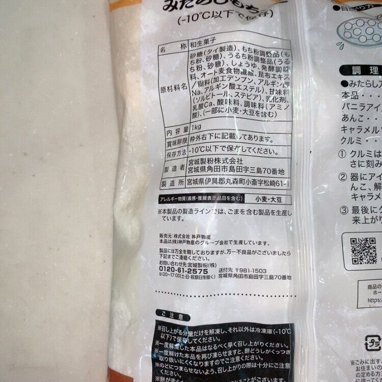 原材料名:砂糖(タイ製造)、もち粉調整品(もち粉、砂糖)、うるち粉調整品(うるち粉、砂糖)、しょうゆ、発酵調味料、オート麦植物繊維、昆布エキス/糊料(加工デンプン、アルギン酸Na,アルギン酸エステル)、甘味料(ソルビトール、ステビア)、乳化剤、乳酸Ca、酸味料、調味料(アミノ酸)、(一部に小麦、大豆を含む)