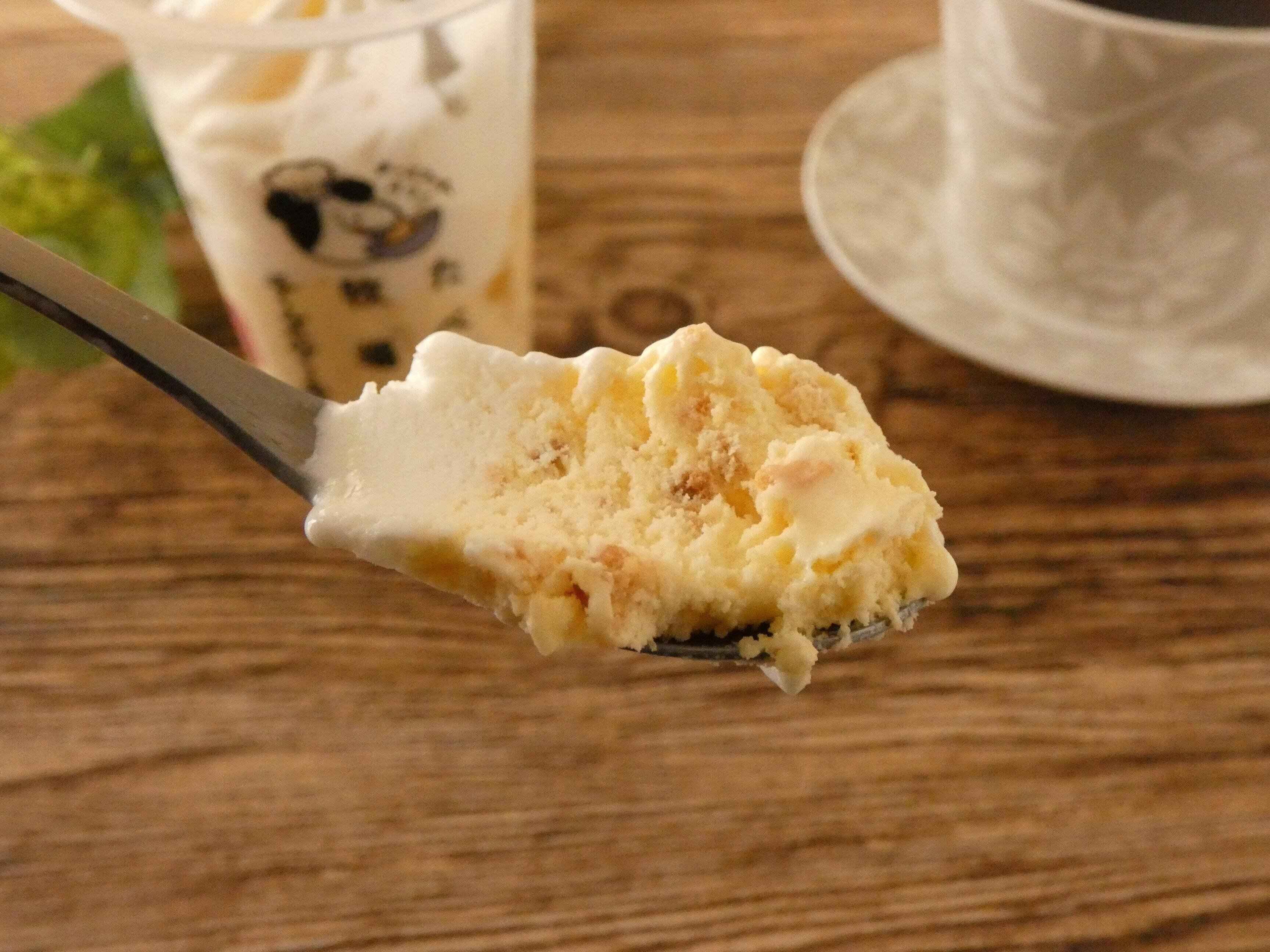 上のミルクアイスはミルクのコクを感じる濃厚な味わいですが、ふんわりとして口溶けがいいです。下のチーズケーキアイスはまったりと濃厚でチーズクッキーのほろほろした食感がアクセントになっています。チーズケーキとミルクの組み合わせはやみつきになるおいしさ!チーズ好きにオススメの絶品スイーツなので、ぜひお試しください。