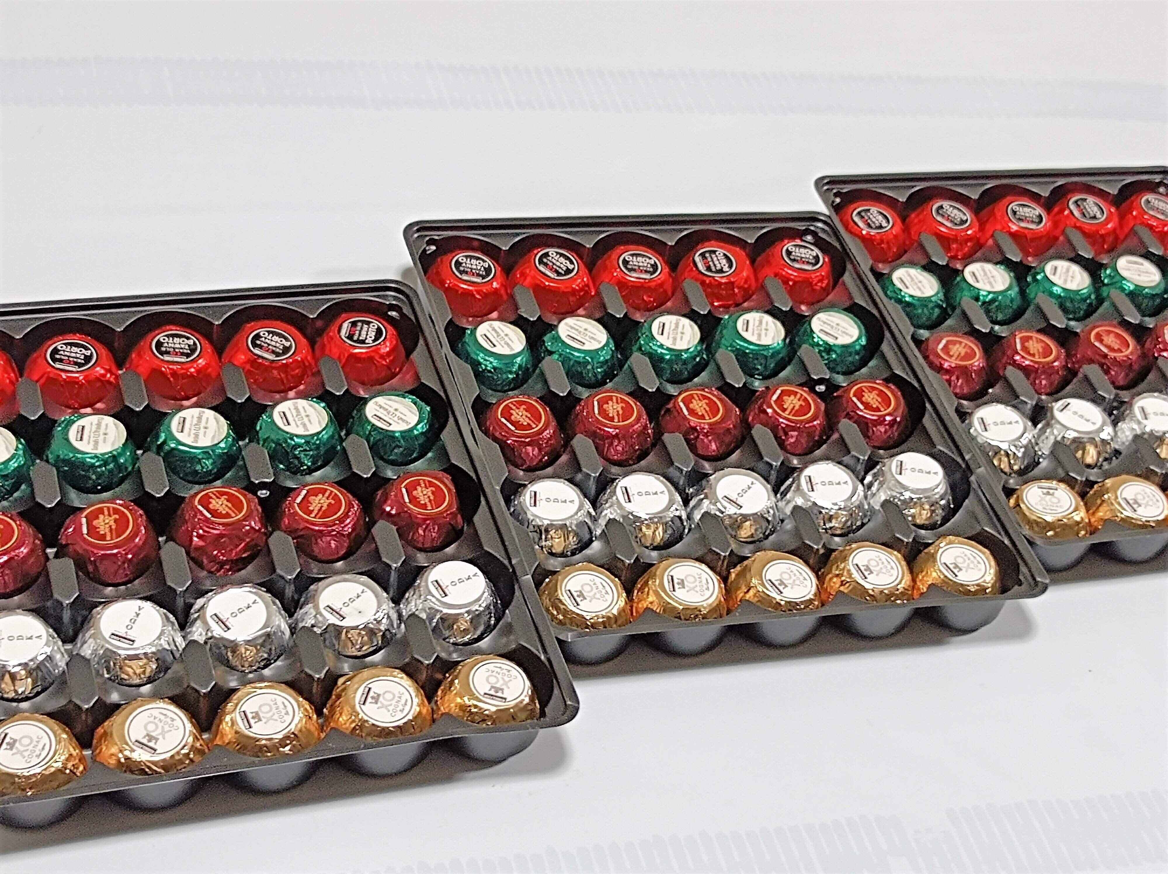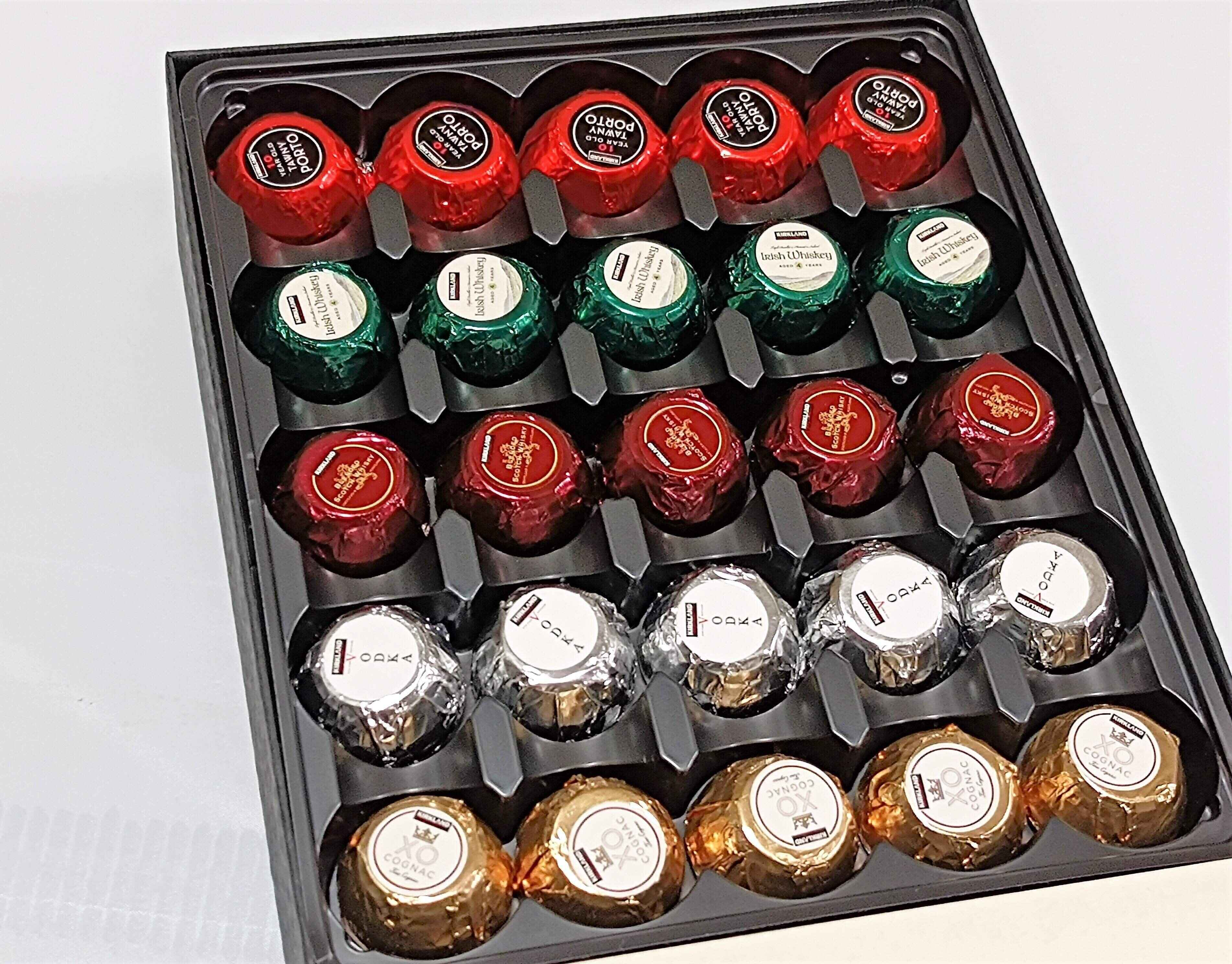 ポートワイン、アイリッシュウイスキー、スコッチウイスキー、ウォッカ、コニャックの5種類のお酒が入っています。また、チョコレートはベルギーのダークチョコです。
