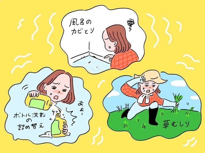 たとえば、シャンプーやリンスの詰め替えやお風呂のカビとり、排水溝の掃除に草むしりなどなど。