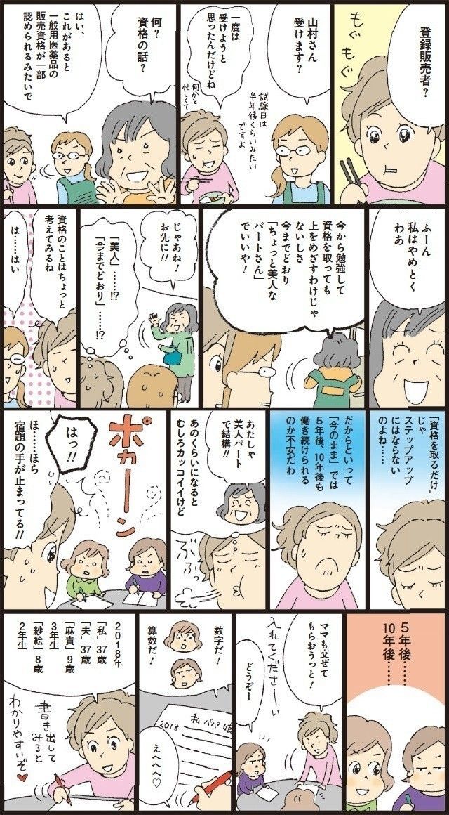 出産後、専業主婦をしていた美久は、再就職しコールセンターのオペレーターに。オペレーターの仕事に不満はなかったが、「やはり正社員になりたい」と一念発起して、転職活動をした。薬局の事務の正社員に応募するも不合格。しかし、「パートなら採用できる。パートから正社員になる道もある」と聞いて系列のドラッグストアで販売のパートに。仕事も家庭もバタバタの毎日を送っている
