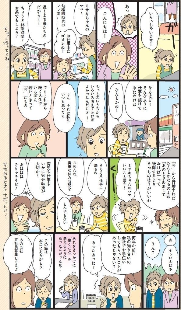 「人生100年」と考えると、この先、どう生きるかを考えることはとても大切。ミサキちゃんのママが言うように「今がいちばん若い」ですし、「もう年だし」と自分でハードルを設けるのはもったいないこと。まだまだ活躍できるはずです。まずは、「できること」「やりたいこと」を明確にして、「世の中のニーズ」と重なることの情報の収集を。そうすることが活躍の新たなフィールド探しにつながっていきます。