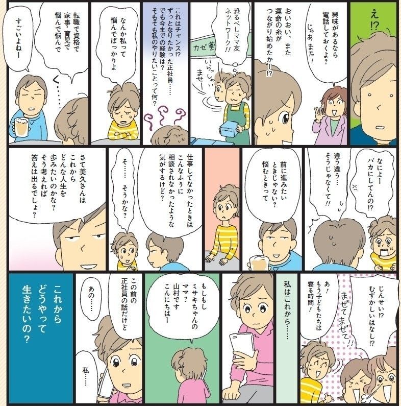 出産後、専業主婦をしていた美久は、再就職しコールセンターのオペレーターに。オペレーターの仕事に不満はなかったが、「やはり正社員になりたい」と一念発起して、転職活動をした。薬局の事務の正社員に応募するも不合格。しかし、「パートなら採用できる。パートから正社員になる道もある」と聞いて系列のドラッグストアで販売のパートに。仕事も家庭もバタバタの毎日を送っている