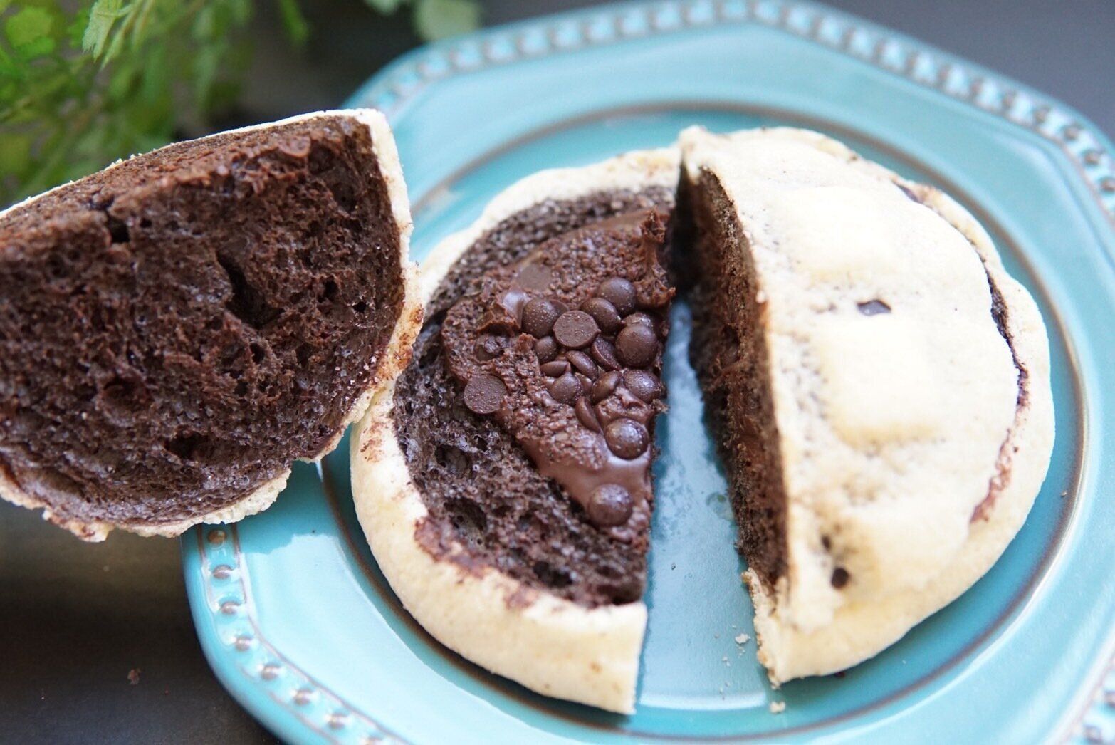 こちらのショコラメロンパン、上下2つにカットされています。開けてみると……カカオ51%のベルギーチョコチップと濃厚なチョコクリームが挟まれていました。