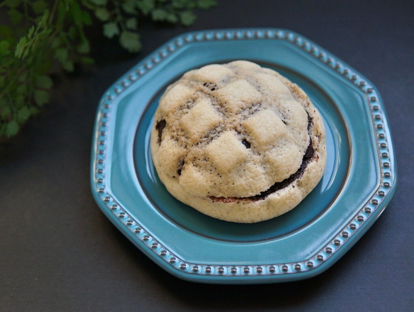 見た目は普通のメロンパン、中はチョコ生地、さらにチョコクリームをサンド。