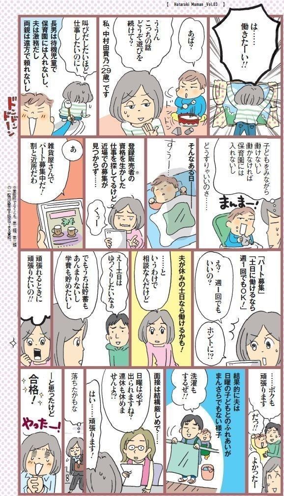 薬科大学を中退し、動物病院の受付、診察補佐のパートに。25 歳で結婚、妊娠して退職。26 歳で長男を出産。長男が1歳4カ月のときに販売員のパートを開始
