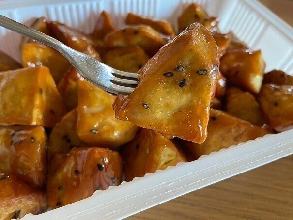 が、筆者のお気に入りは半解凍状態で食べること!周りの飴部分がガリっとザクッと香ばしい食感を楽しめ、中のおいもはねっとりなめらか。温かいほくほくの大学いももおいしいけど、ザクザクの大学いもも最高ですよ!