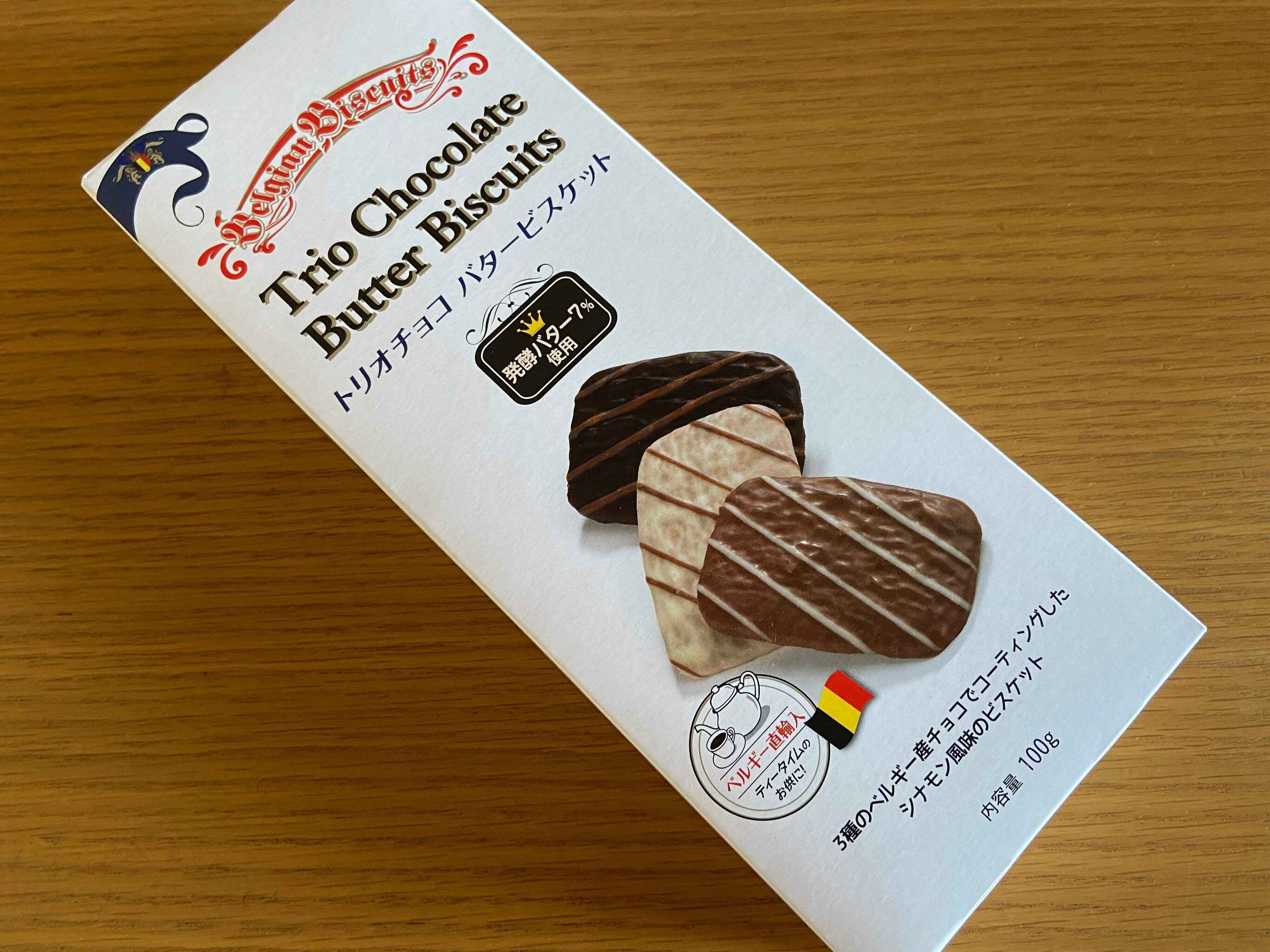 まずはこちら、業務スーパーではベルギー直輸入のおいしいお菓子がいろいろ並んでいますが、なかでもおすすめなのが「トリオチョコバタービスケット」(購入時価格:289円)。