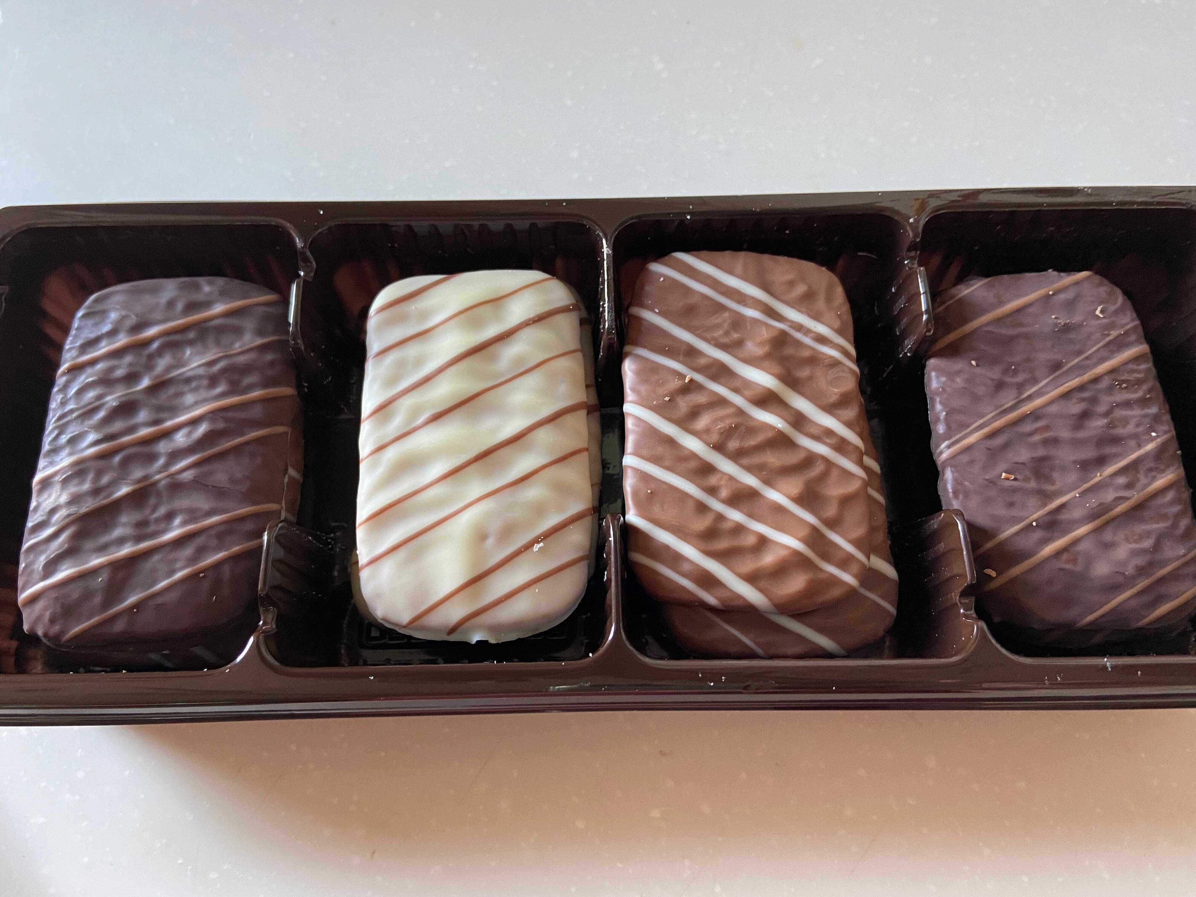 シナモン風味のビスケットがミルクチョコ・ホワイトチョコ・ダークチョコでコーティングされているお菓子です。