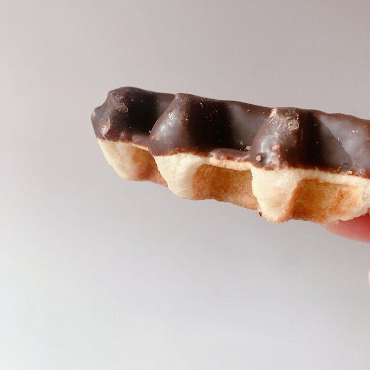 ノーマルなベルギーワッフルの半面に、しっかりダークチョコレートがコーティングされています。