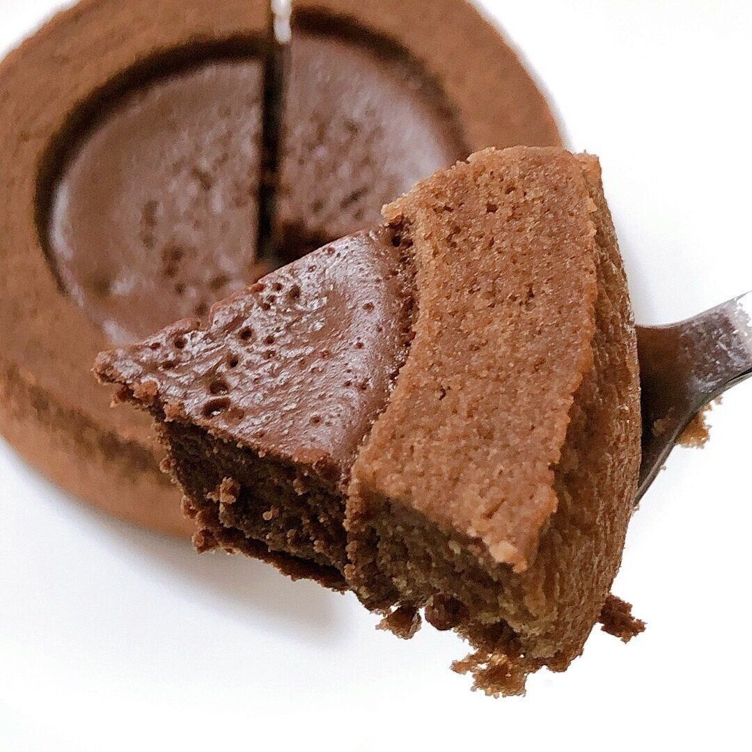 チョコケーキは程よくビター。生チョコを使っているので、ねっとり濃厚です。シロップがしみたしっとりふかふかチョコバウムと一体となっています。