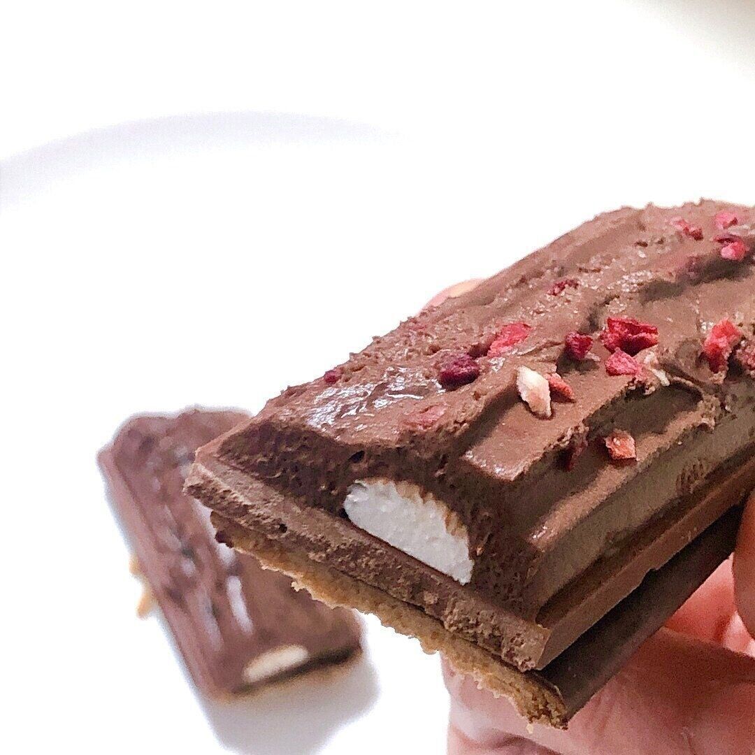 サブレと板チョコのさくっとした軽快な食感が心地よく、こってり甘い練乳クリームとマイルドなほろ苦さの生チョコが調和し、上品な甘さを演出。なめらかに口どけていきます。トッピングのドライ苺の酸味とほろ苦いカカオニブを時折感じます。