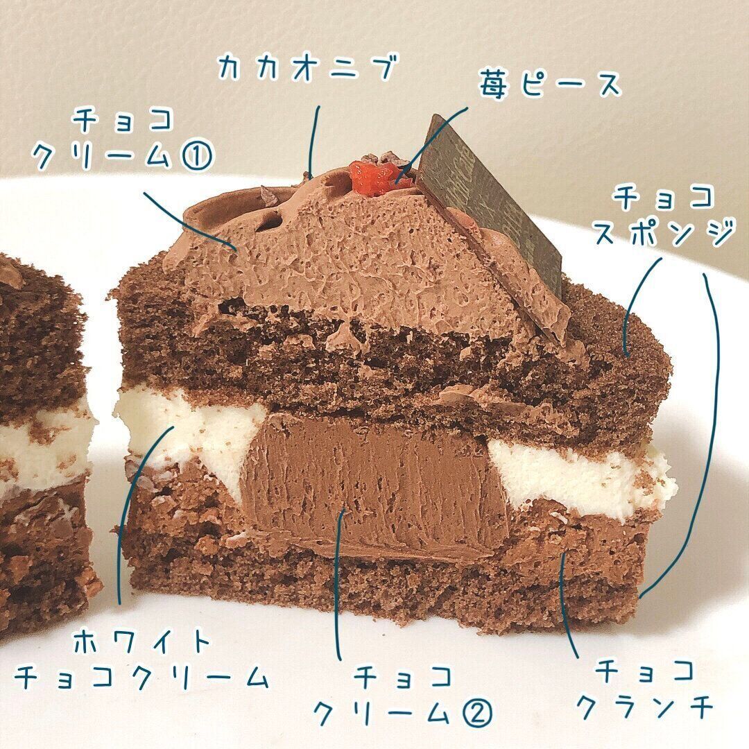 チョコスポンジの間にチョコクランチとホワイトチョコクリームが層を成し、センターにチョコクリームがどっしり隠れています。トッピングのカカオニブとドライ苺ピースが華やかです。