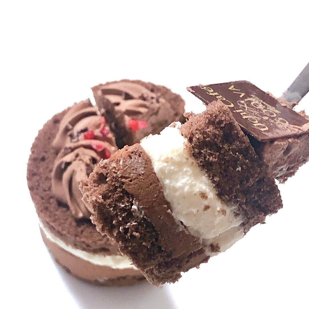 ざくざくのクランチとふわふわのスポンジの食感のコントラスト。センターのチョコクリームは、ビターの中に甘酸っぱさもありながら華やかな余韻で、濃厚だけどビターすぎない専門店のような本格派。ホワイトチョコクリームでコクがアップし、奥行きのある味わいに仕上がっています。上のクリームはあっさり軽めで、バランスが取れていました。