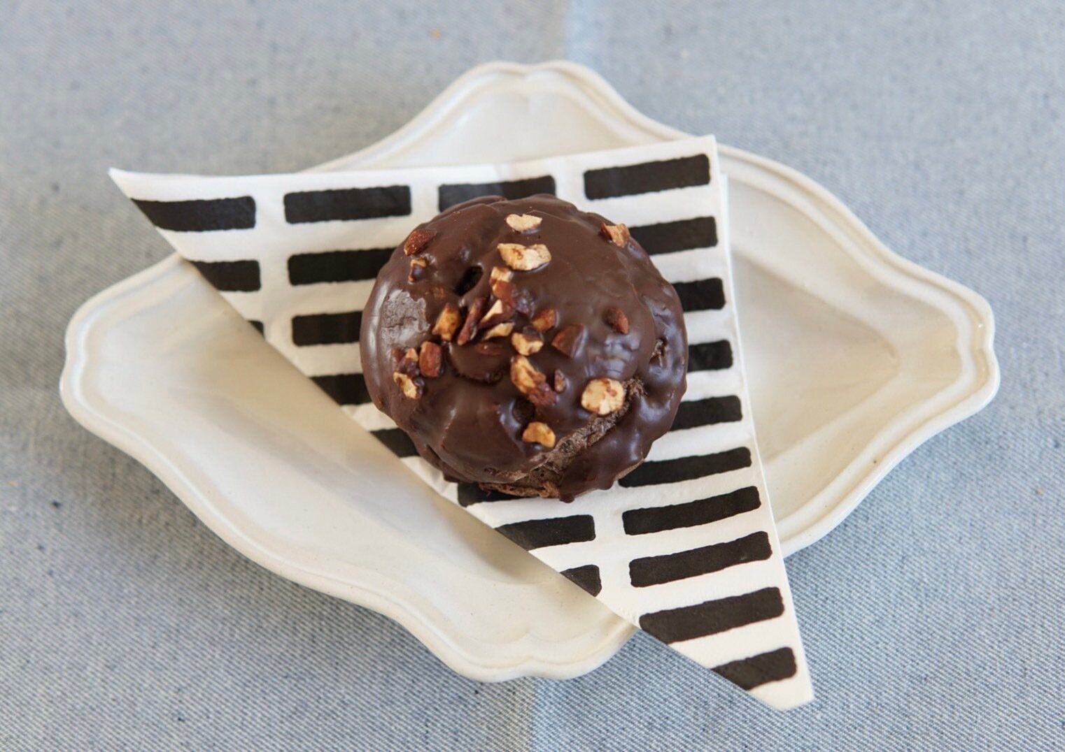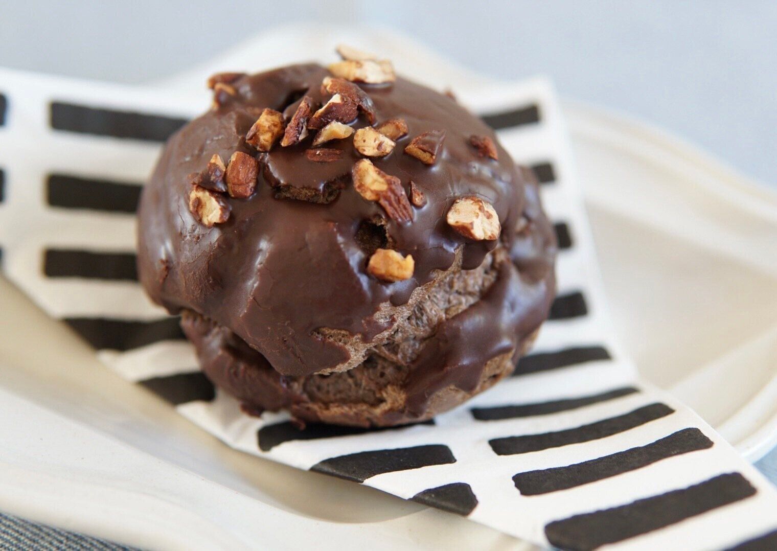 シュー生地までチョコ、上からもたっぷりチョコがかかり、上には粗くカットされたアーモンドがパラパラと。全体的にふんわりというよりは、ゴツゴツとした見た目に仕上がっています。