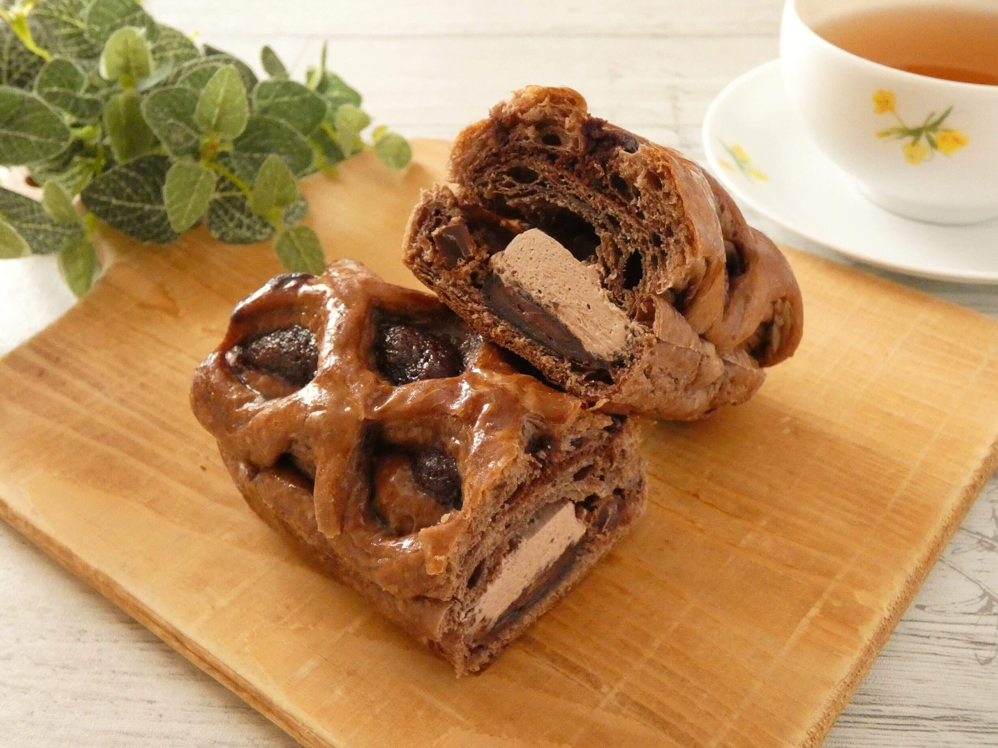 チョコクリームが包まれたチョコ風味のデニッシュ生地で、間にはチョコホイップと角切りチョコが入っています。