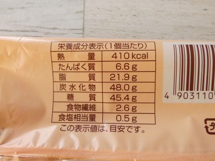 栄養成分表示を見ると1個のエネルギーは410kcal。チョコづくしなので予想通りのカロリーの高さです。